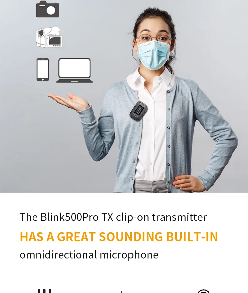 Упаковочный лист B1 1 × приемник Blink500 Pro RX со встроенным зажимом и башмаком для камеры (интегрированный с OLED-дисплеем) 1 × трансмиттер Blink500 Pro TX с OLED-дисплеем и встроенным микрофоном 1 × чехол для зарядки Blink500 Pro B1 BOX 1 × сумка на молнии 1 × 1 '(30,5 см) позолоченный 3,5 мм TRS к TRS выходной кабель для камер 1 × 1 '(30,5 см) позолоченный 3,5 мм TRS к TRRS выходной кабель для смартфонов и планшетов 1 × 1 '(30,5 см) позолоченный кабель для зарядки от USB-C до USB-A 1 × 1 '(30,5 см) позолоченный кабель Micro USB для зарядки USB-A Всенаправленный петличный микрофон 1 × SR-M1 1 × петличный зажим для микрофона типа «Аллигатор» 1 × пенопластовое лобовое стекло Lavalier 1 × ветровое меховое ветровое стекло для передатчика TX 1 × Гарантийный талон 1 × руководство пользователя