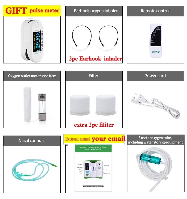 Версия на английском языке (сейчас в наличии) Бесплатная покупка пульсометра DDT-2A одна версия может поддерживать использование одного человека, Двойная версия может поддерживать одновременное использование двух человек. DDT-2A/DE-2A (в наличии сейчас) 1: функция отрицательных ионов: 6 миллионов/см3 2: настройка времени: самый длинный 180 минут 3: функция энергосберегающего режима 4: функция сна 5: автоматическая функция защиты от отключения питания (Двойная страховка) 6: дистанционное инфракрасное управление 7: функция аккумулирования кислорода 8: для двойной ингаляции Параметры продукта: Тип товара: DDT-2A /DE-2A (сейчас в наличии) Номинальное напряжение: AC220V/110v (версия на английском языке/на китайском языке) Входная мощность: 230 Вт Вес нетто: 8 кг Производство кислорода: PSA Управление дисплеем: светодиодный сенсорный экран Расстояние управления: 18 метров инфракрасный контроль Шум: ≤ 45 дБ Размер: 404*182*383 мм Поток кислорода: 2 л-9 л/мин С интерфейсом работы английской версии Язык отображения: Английская версия (стандарт) С руководством на английском языке: Да