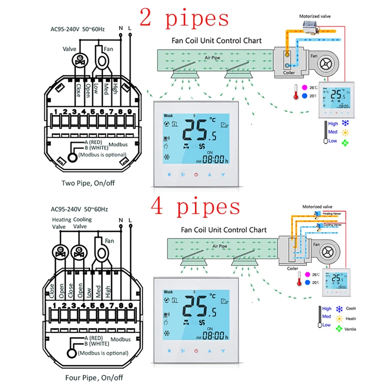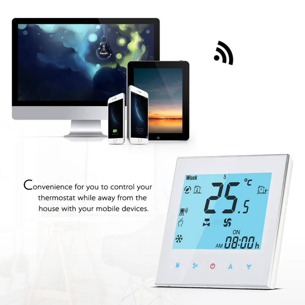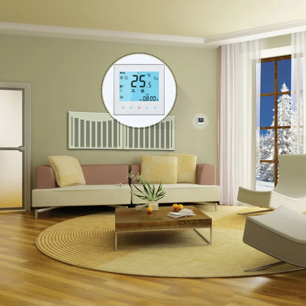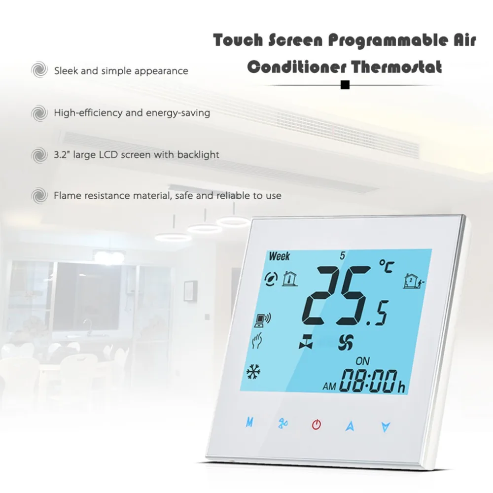 Термостаты сенсорного экрана предназначены для включения/выключения управления вентиляторами и клапанами в приложениях кондиционера с помощью сравнения комнатной температуры и настройки температуры для достижения цели комфорта и экономии энергии. Это термостат на основе микропроцессора с ЖК-дисплеем.