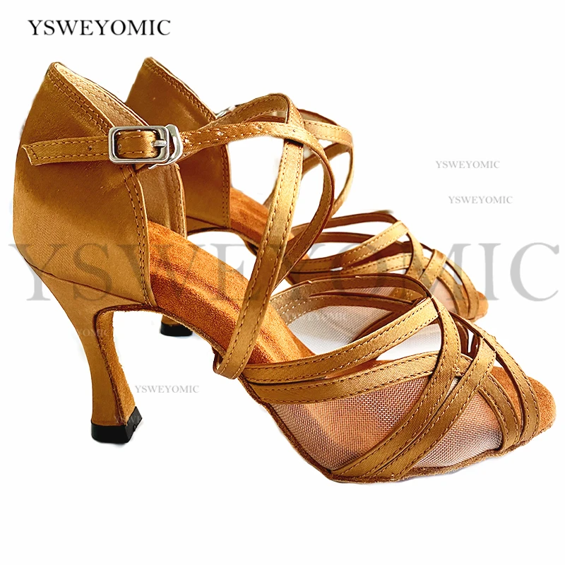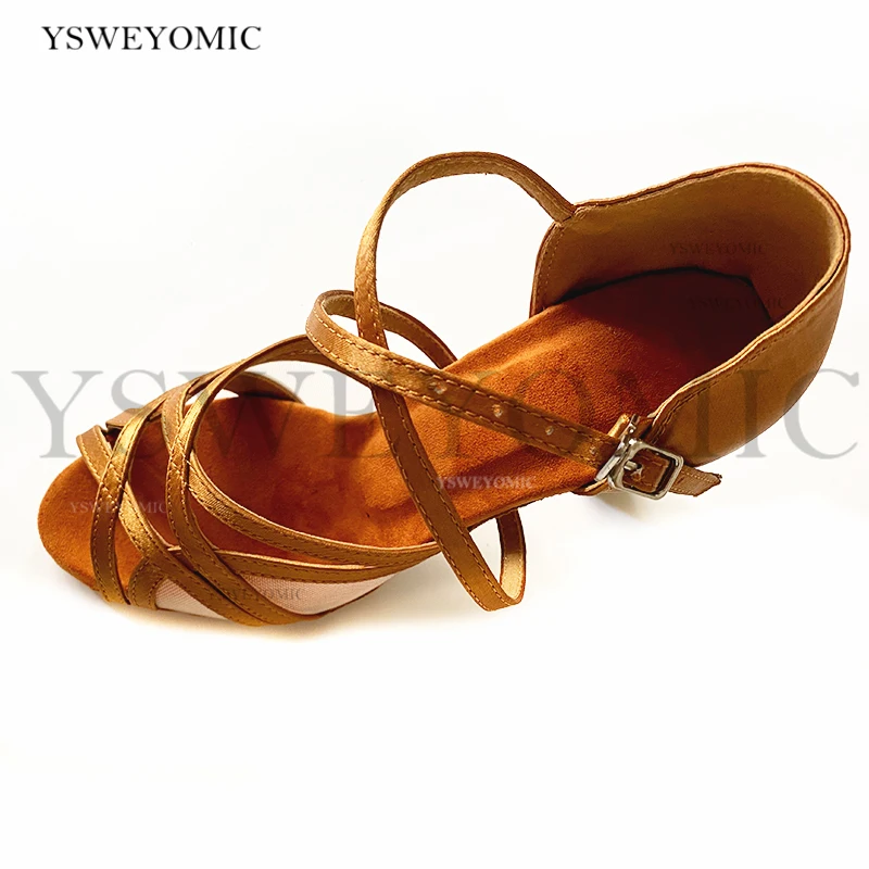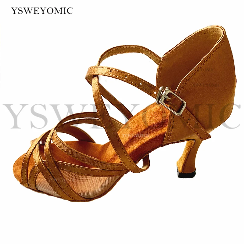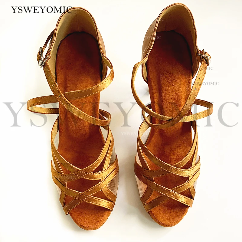Новинка; Женские туфли для латинских танцев; Туфли для бальных танцев; Атласные коричневые туфли для танцев с каблуком 9 см