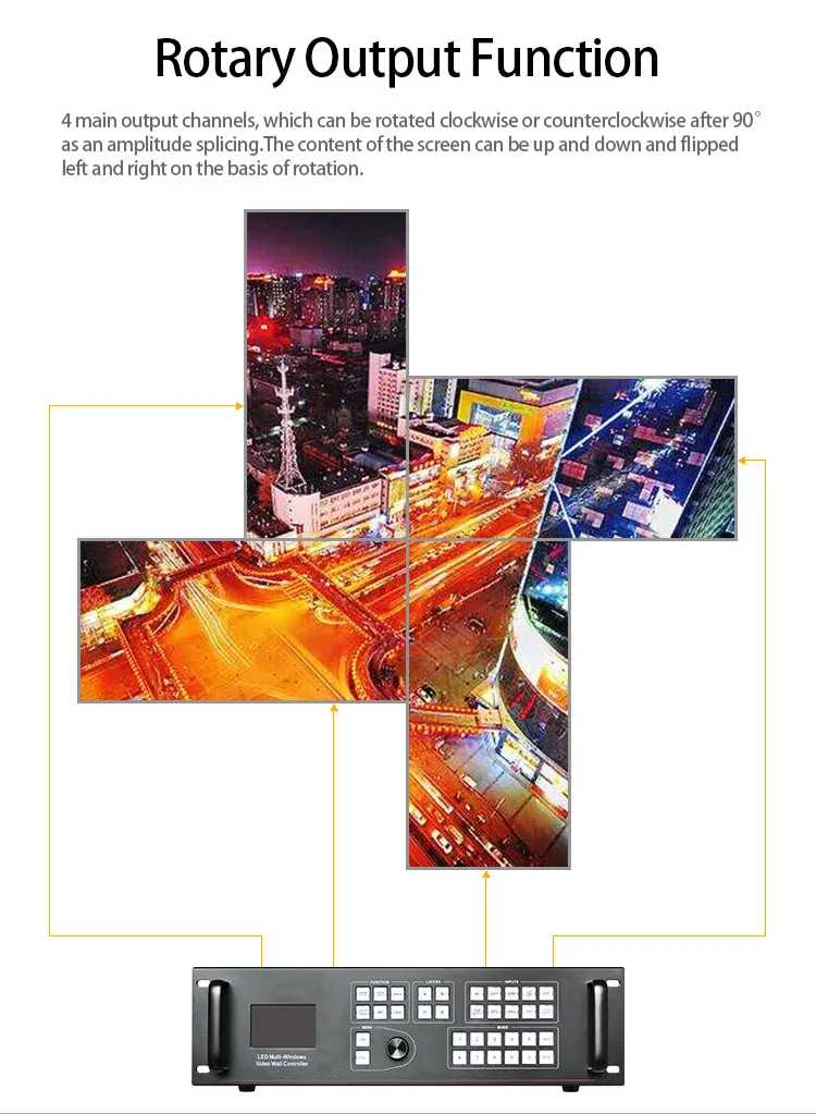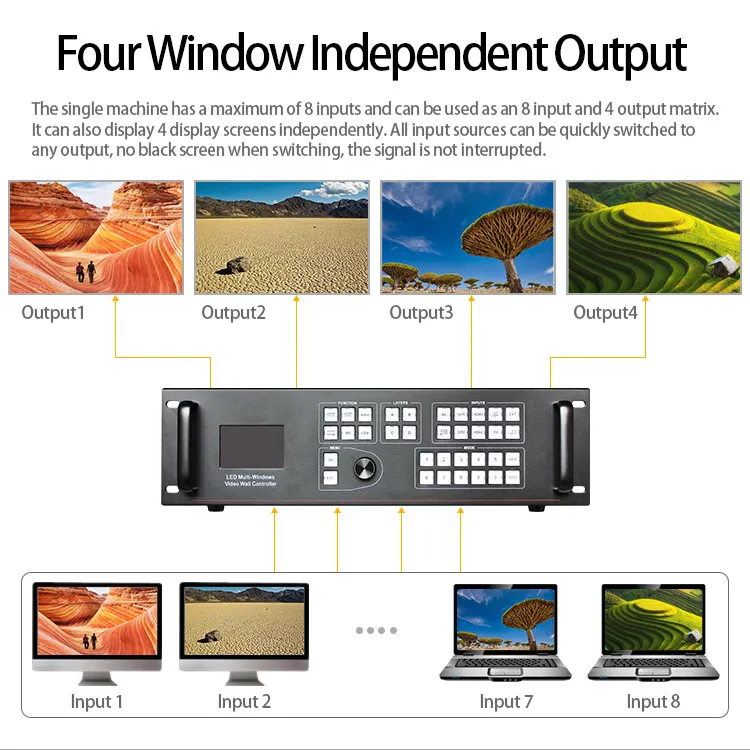 Поддержка входа 3840*2160 @ 60 Гц Поддержка одновременного ввода четырех 4K * 2K 4. Произвольное масштабирование и роуминг Windows ► Наибольшее разрешение сращивания 30720*640 @ 60 Гц 、 9216*2304 @ 60 Гц 、 6144*3072 @ 60 Гц, 4096*3840 @ 60 Гц ► 21,0 миллионов пикселей можно настроить разрешение ► Индивидуальный вход EDID Вращение изображения и Функция зеркала Поддержка переключения времени и блокировки 10 режимов сохранения и 8 горячих клавиш вызова ► Функция «черный» и «замораживание» Поддержка SDI или USB входа (опционально) Выход декодирования звука для синхронизации Поддержка Wi-Fi 、 управление RS232 Поддержка 16 стандартных отправляющих карт Можно установить 8 стандартных отправляющих карт