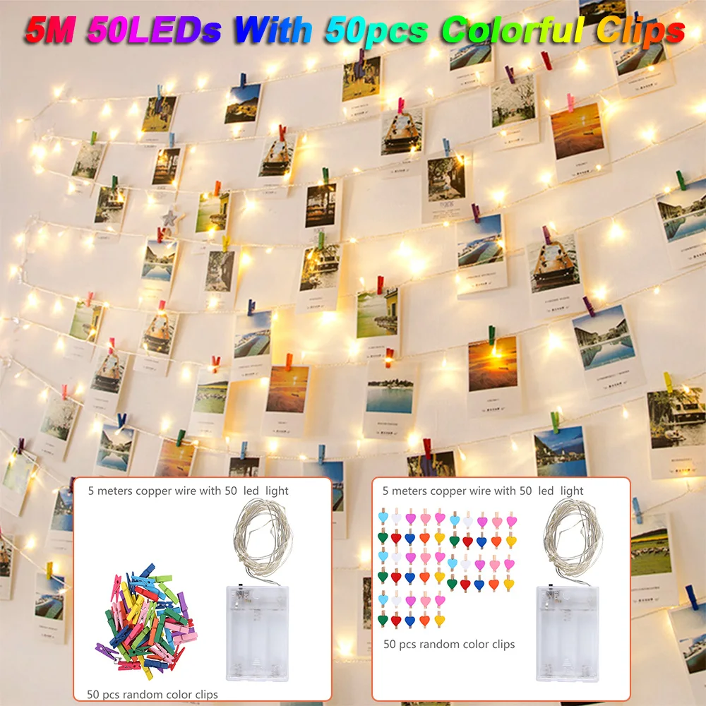 Фото клип струнные светильники 5 м 16,4 фута 50 светодиодный светильник с 50 красочными зажимами для подвешивания фотографий фото струнные светильники с зажимами батарейка USB управляемая идеальная спальня настенный Декор Свадебные украшения