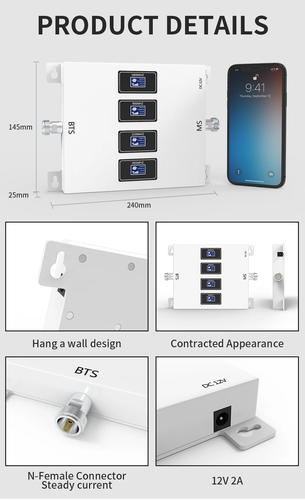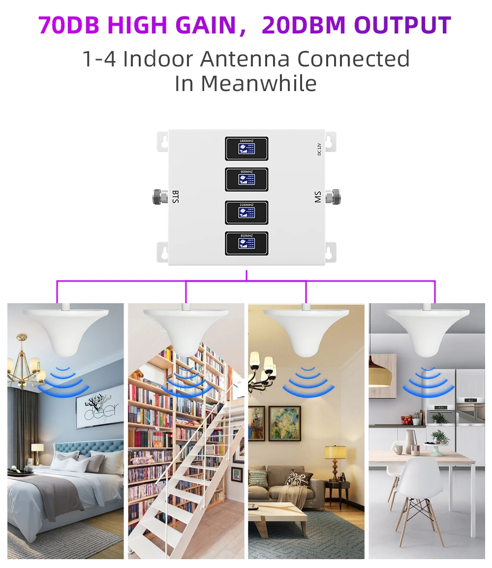 Высокий коэффициент усиления 1,70 дБ, выход 20dbm. В то же время может быть подключен 1-4 внутренних антенны.
