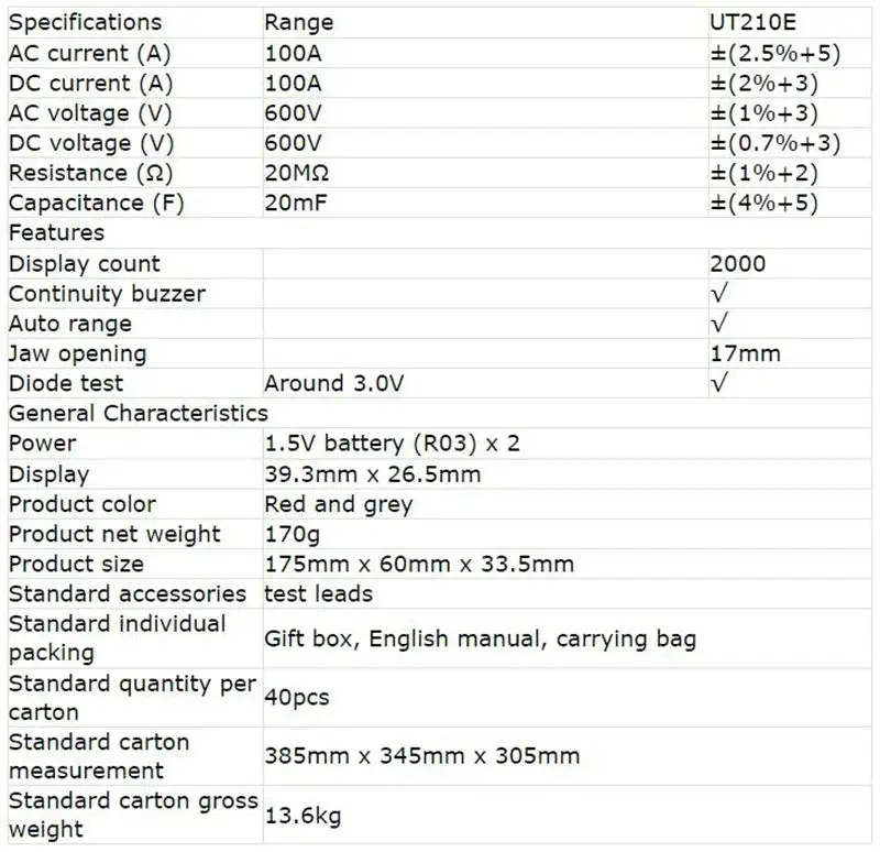 UT210 серия мини-клещи UT210 серия мини цифровой клещи с высокой надежностью, высокая безопасность, Автоматический диапазон, миниатюрность. Может точно измерять небольшие токовые сигналы; Чип продукта настроит режим запуска VFC, внутренний будет проходить через определенную схему фильтра, высокочастотный сигнал помех фильтруется для обеспечения точности данных измерений! Может быть применен к случаю с VFC преобразованием частоты напряжения, тока, полной защиты от перегрузки и уникальный внешний вид дизайн, что делает его новое поколение практичных электрических измерительных приборов с более отличной производительностью. Характеристики для UT210E1. Измерение тока постоянного тока переменного тока2. Измерение сопротивления3. ЖК-подсветка4. Непрерывный зуммер5. Измерение VFC6. NCV, Бесконтактное Обнаружение7. Автоматический диапазон8. Истинное измерение RMS9. Хранение данных10. Нулевое измерение11. Измерение диода/емкостиРаботает хорошо, жалко что нет инструкции на русском языке или видеообзора, об использовании. ... Читать отзыв полностью...