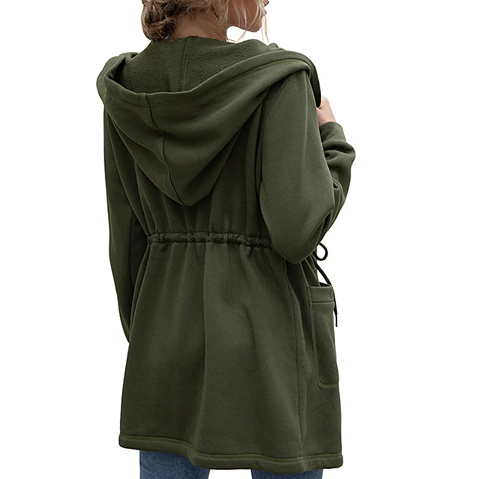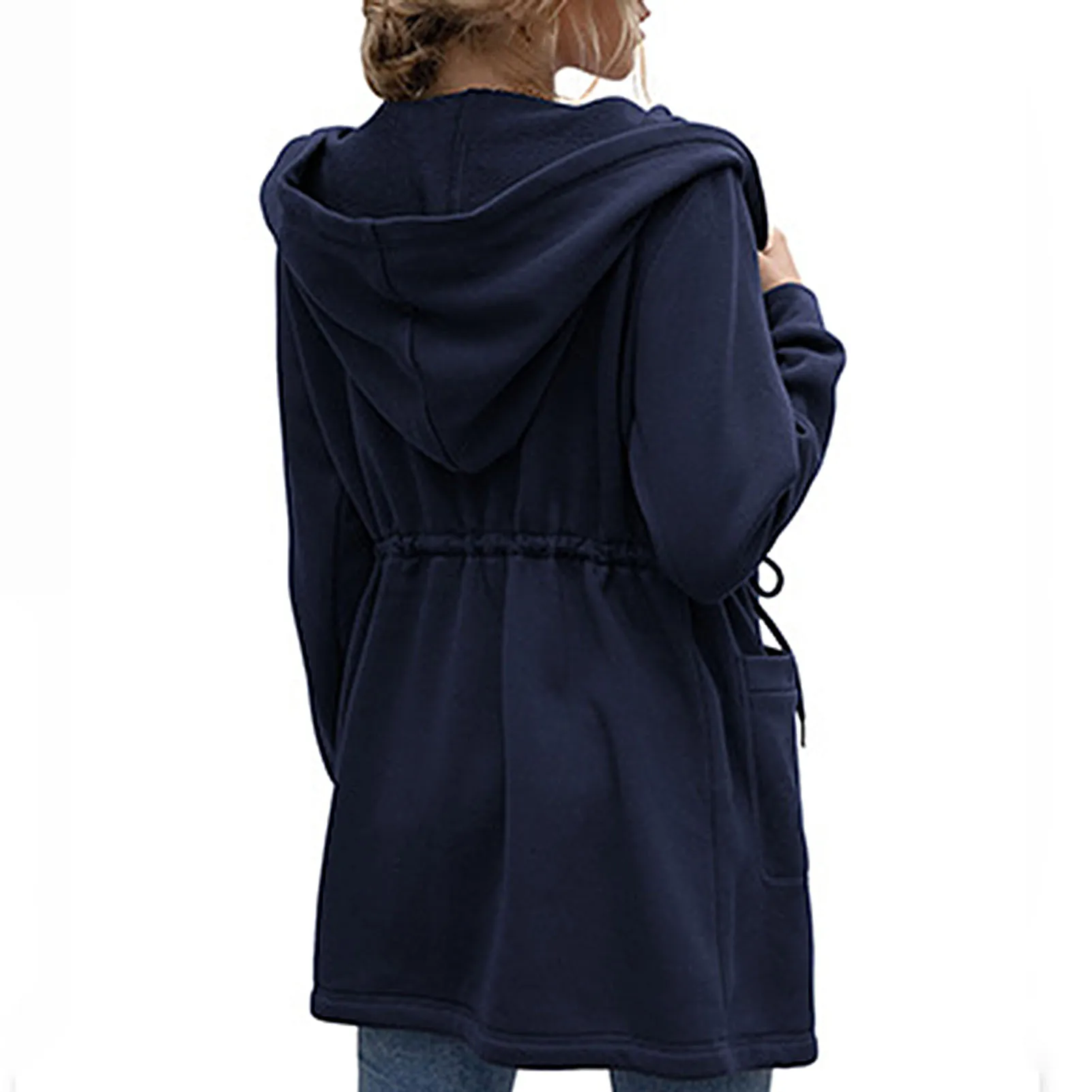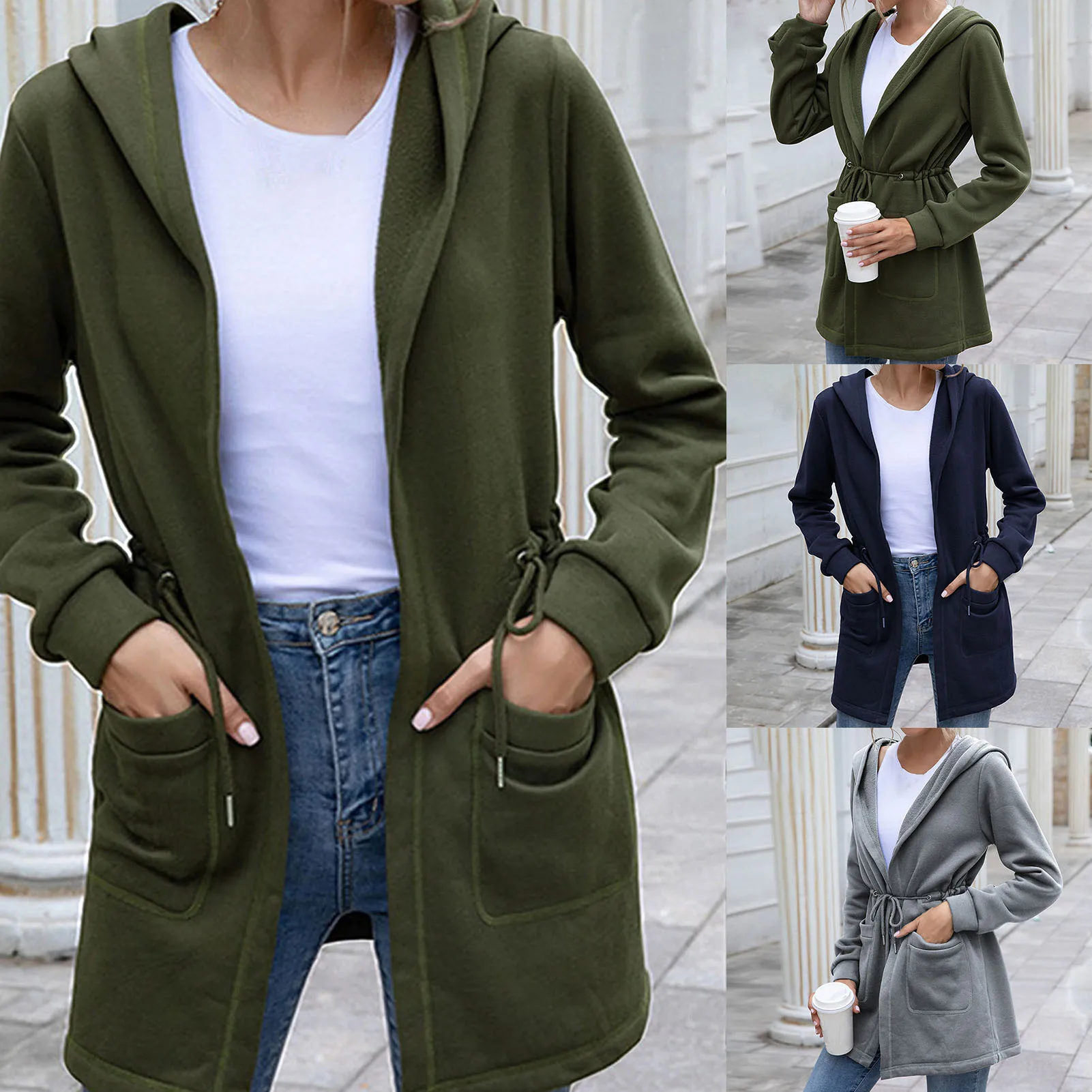 Женский осенне-зимний кардиган средней длины на завязках с капюшоном