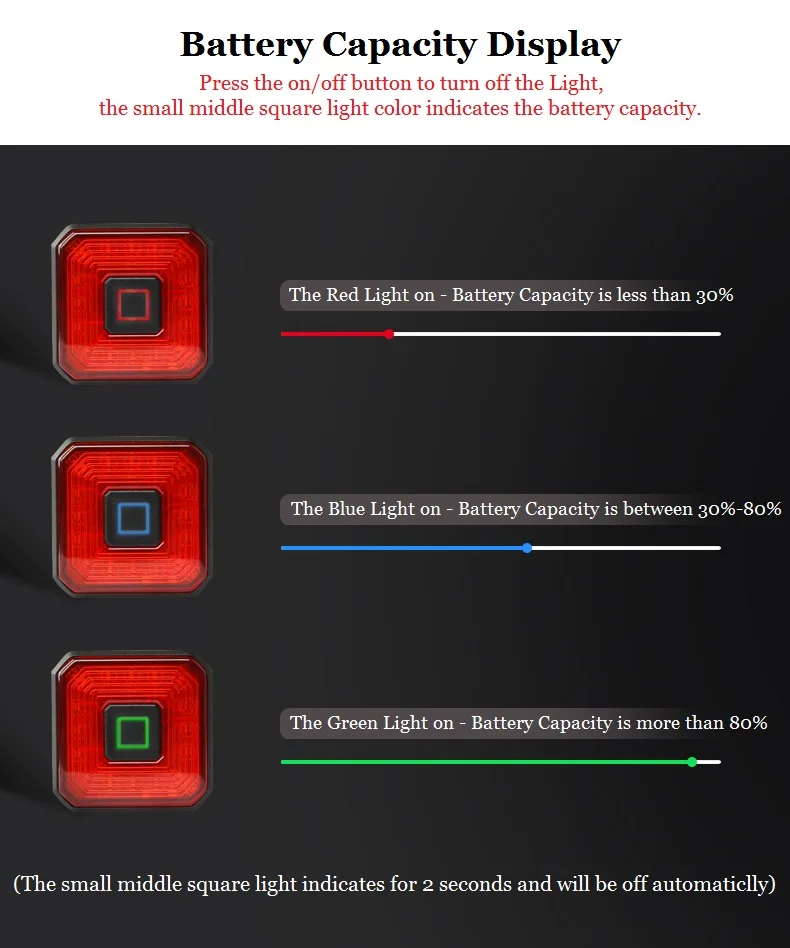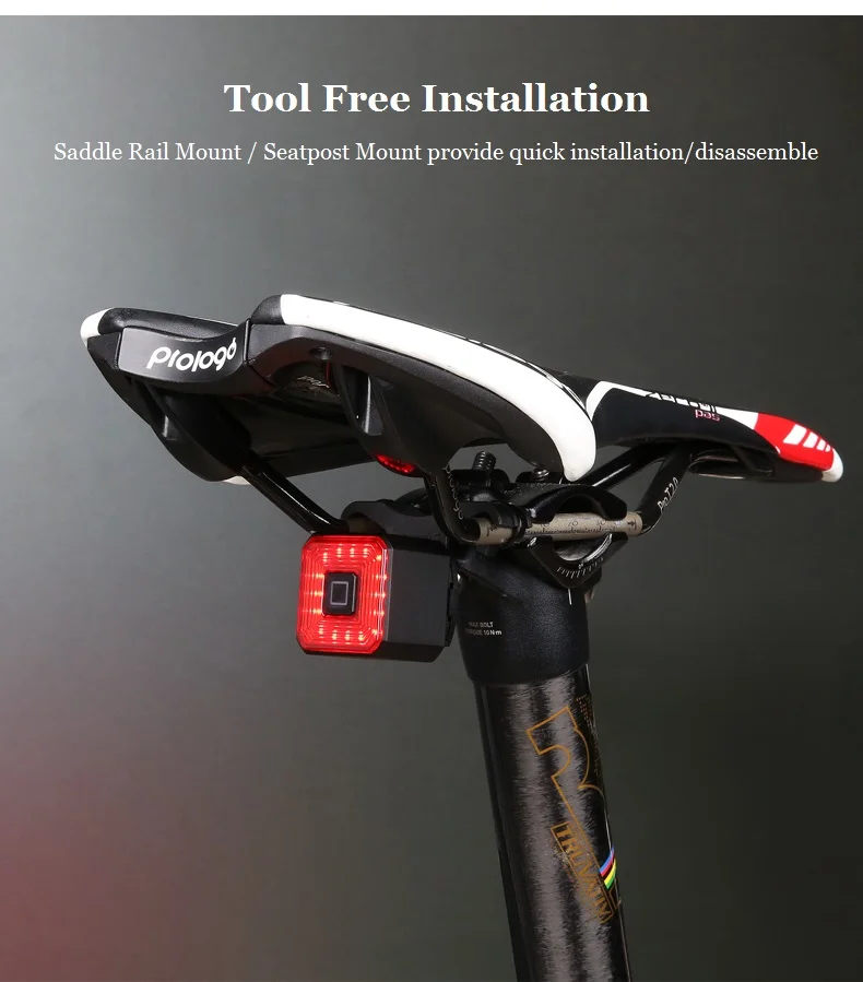 * Model: WT-005 * Waterproof: IPX4* Size: 24.2x31.3 mm* Weight: Approx. 27g* Battery Capacity: 350mAh* Charging Time: 140 Minutes * Charging Current: 5V-280mAh * Light Shell Material: Aluminium Alloy* Installation: Saddle Rail Mount/Seatpost Mount ** Brake Sensing** Auto Brightness** Auto Start / Stop** Enhanced Visibility** Light Weight DesignShowcase