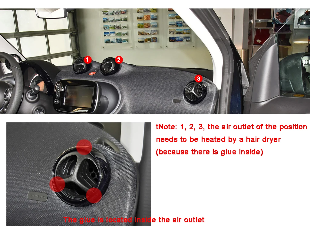 (Справа + по центру) Способ установки: Используйте фен для нагревания воздуховода перед разборкой (потому что внутри есть клей) Примечание: Не используйте грубую силу, чтобы сломать выход воздуха После нагрева руками большим пальцем в отверстие, потяните вверх, вытяните Снимите оригинальный белый круг автомобиля Выньте оригинальную автомобильную розетку и снимите шар Заменить воздуховыпускное отверстие Застревают в исходное положение Обратите внимание на оригинальную модель белого цвета с тремя картами Пряжка плотно Нажимая в исходное положение пряжки карты (окруженное нажатием), услышите щелчки, которые были установлены на месте