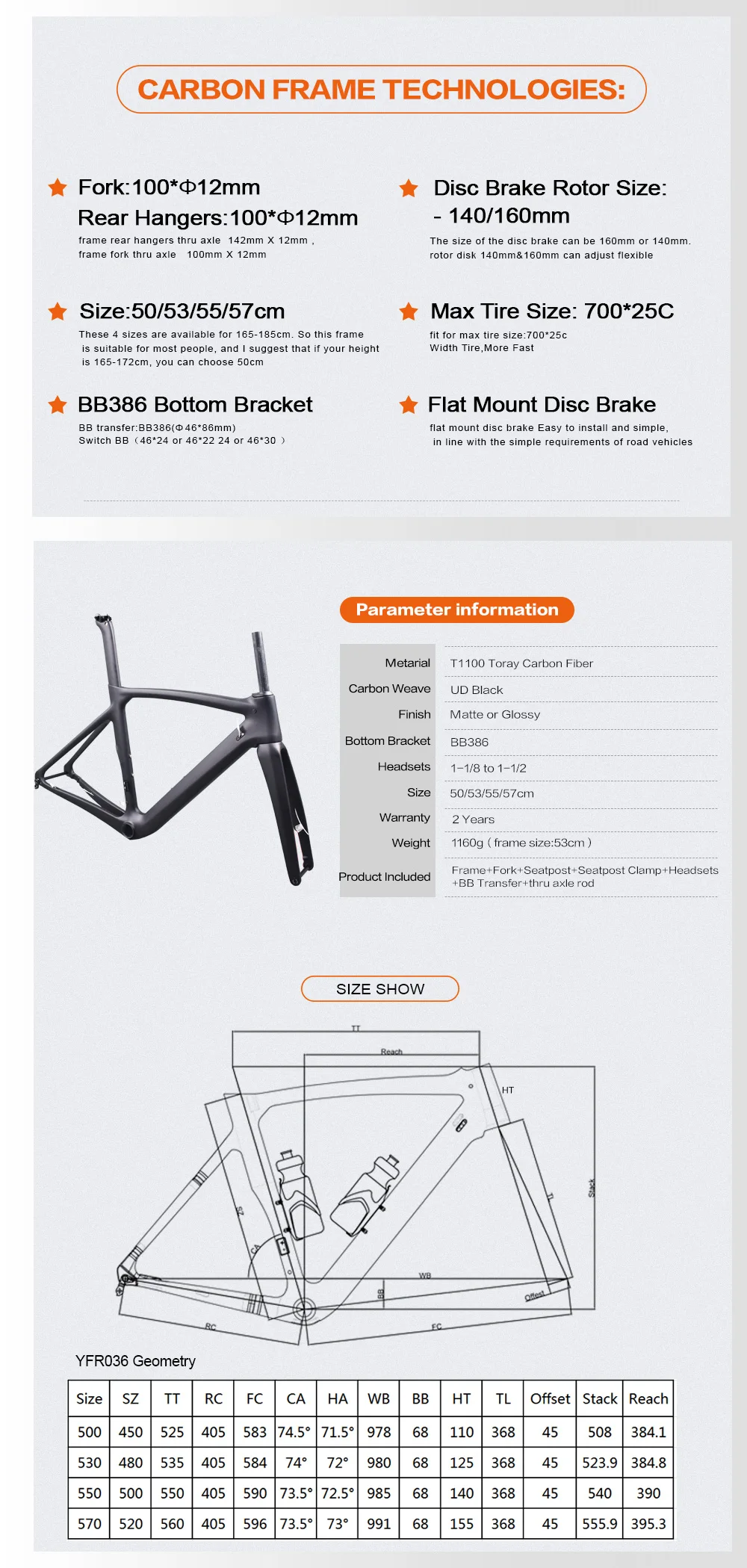 1. Название бренда: Airwolf2. Тип рамы: YFR036 углеродистая дорожная рама3. Материал оправы: T1100 Toray углеродное волокно4. Тип велосипеда: Аэро Дорожный велосипед5. Углеродное переплетение: UD6. Отделка: матовая или глянцевая7. Нижний Кронштейн: BB386(41*86 мм)8. Гарнитуры: вверх 1-1/8 ''вниз 1-1/2''9. Тип тормоза: дисковый тормоз10. Размер ротора диска: 140 или 160 мм11. Вилка через ось: 100*12 мм12. Рама через ось: 142*12 мм13. Кабельная маршрутизация: Внутренняя кабельная маршрутизация14. Подседельный штырь: в рамке15. Передний переключатель: Стационарный тип16. Подходящий переключатель: Di2 или механический17. Вес: рама 1161 г (53 см), вилка 488 г, подседельный штырь 229 г18. Рамка Размеры: 50/53/55/57 см19. Максимальный размер шин: 700 * 25C20. Гарантия: 2 года21. Опция OEM: цвета и с логотипом22. В комплект входит: рама, вилка, подседельный штырь, гарнитуры, зажим подседельный штырь, ВВ передача, через осевой стержень, алюминиевые деталиКлиенты отмечали: если вам нужны цвета с логотипом, пожалуйста, оставьте сообщение! Или свяжитесь с отделом продажЗаказ!Гарантия обслуживания покупайте с уверенностью