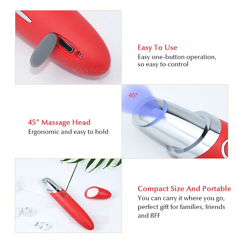 1. Синий светильник + отрицательный ион + вибрация (низкий) режим: частота вибрации 7200 в минуту, отрицательные ионы могут вводить питательные вещества крема для кожи, для лучшего впитывания кожи и восстановления упругости кожи. 2. Красный светильник + отрицательный ион + вибрация (высокая) + режим нагрева: частота вибрации 12000 в минуту, успокаивающий массаж для обеспечения омоложения кожи, нагрев (45 °C) ионная функция позволяет эффективно снять усталость глаз и уменьшить темные круги. 3. Горизонтальная конструкция ручки для обработки на 45 градусов эргономична и удобна в хранении 4. Простое управление одной кнопкой. 5. Зарядная головка USB