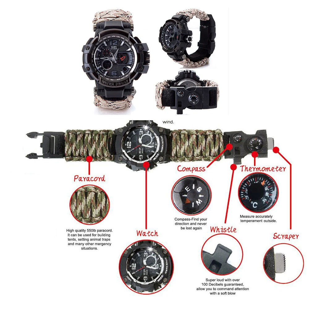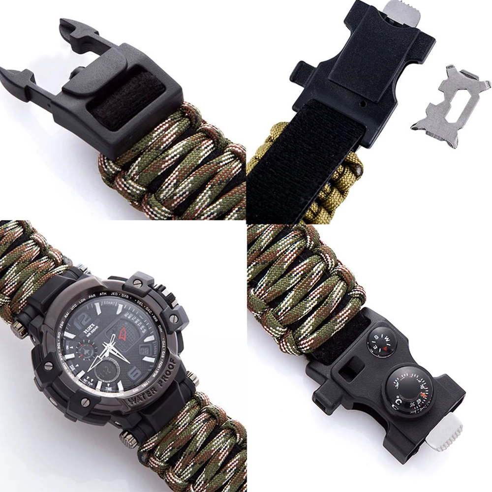Часы для выживания на открытом воздухе, многофункциональные водонепроницаемые военные тактические часы с Паракордом, браслет для кемпинга, пешего туризма, аварийное снаряжение, EDC