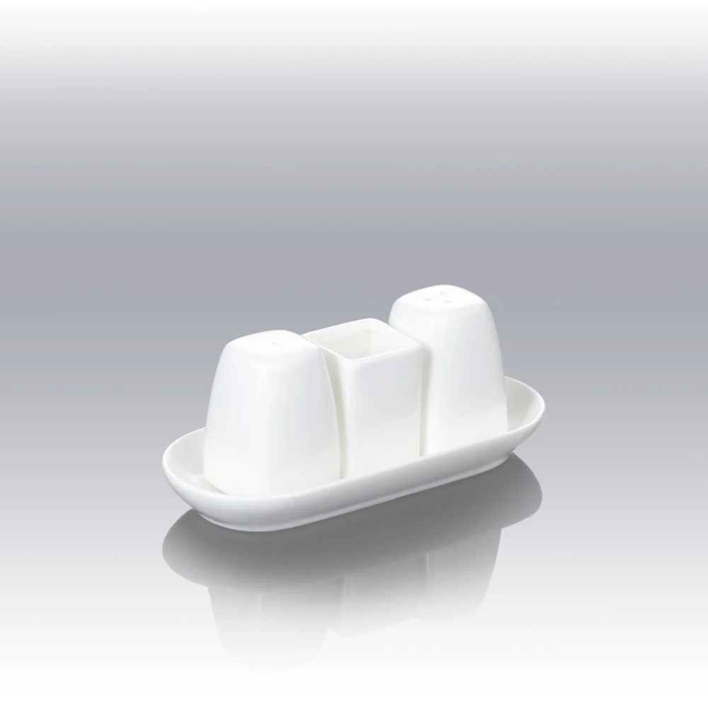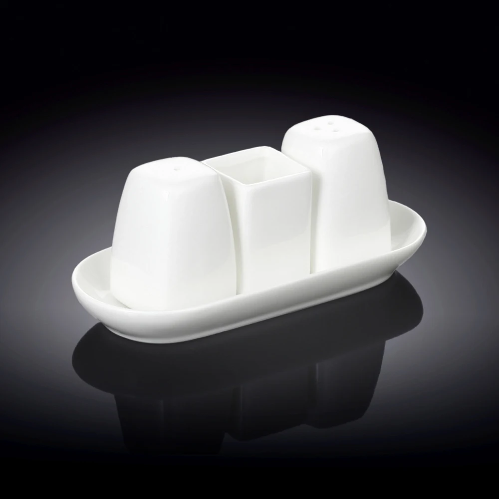 Набор для специй WILMAX – элегантная классика сервировки стола. Лаконичный дизайн, универсальная форма, традиционный белый цвет, гладкость и блеск текстуры – маленькие помощники станут стильным акцентом. Комплект состоит из четырех предметов: солонки, перечницы, держателя для зубочисток и овального блюдца-подставки. Наличие крышки в основании позволяет удобно засыпать специи. Благодаря высококачественному экологически чистому фарфору предметы набора заметно легче аналогичных изделий. Комплект отличается повышенной ударопрочностью и обладает повышенной защитой от скалывания.