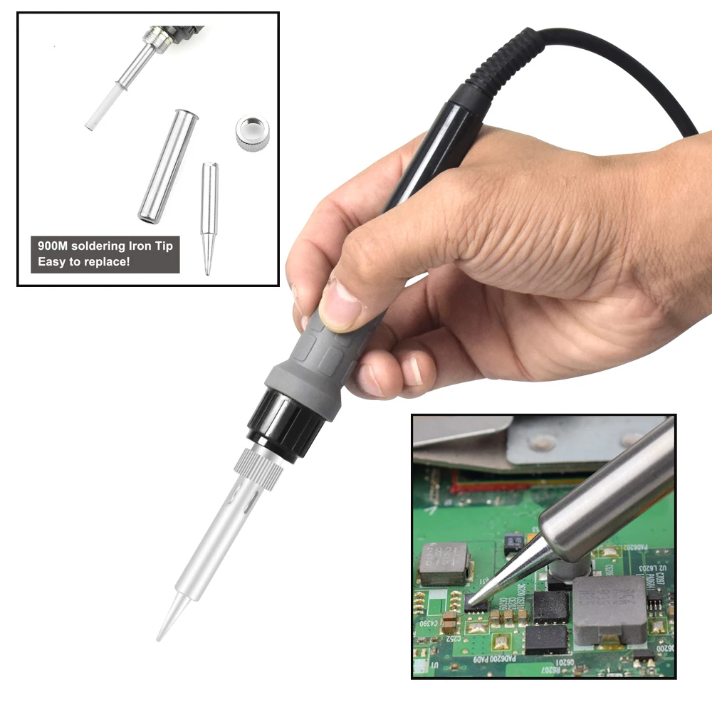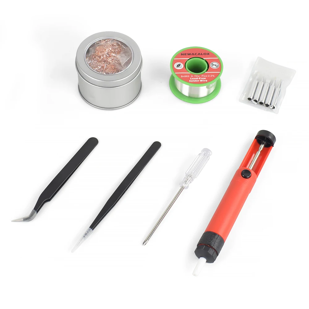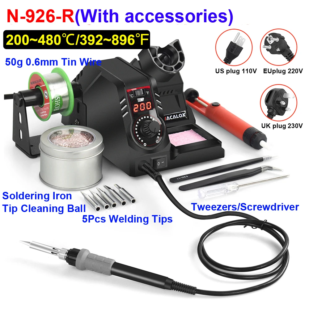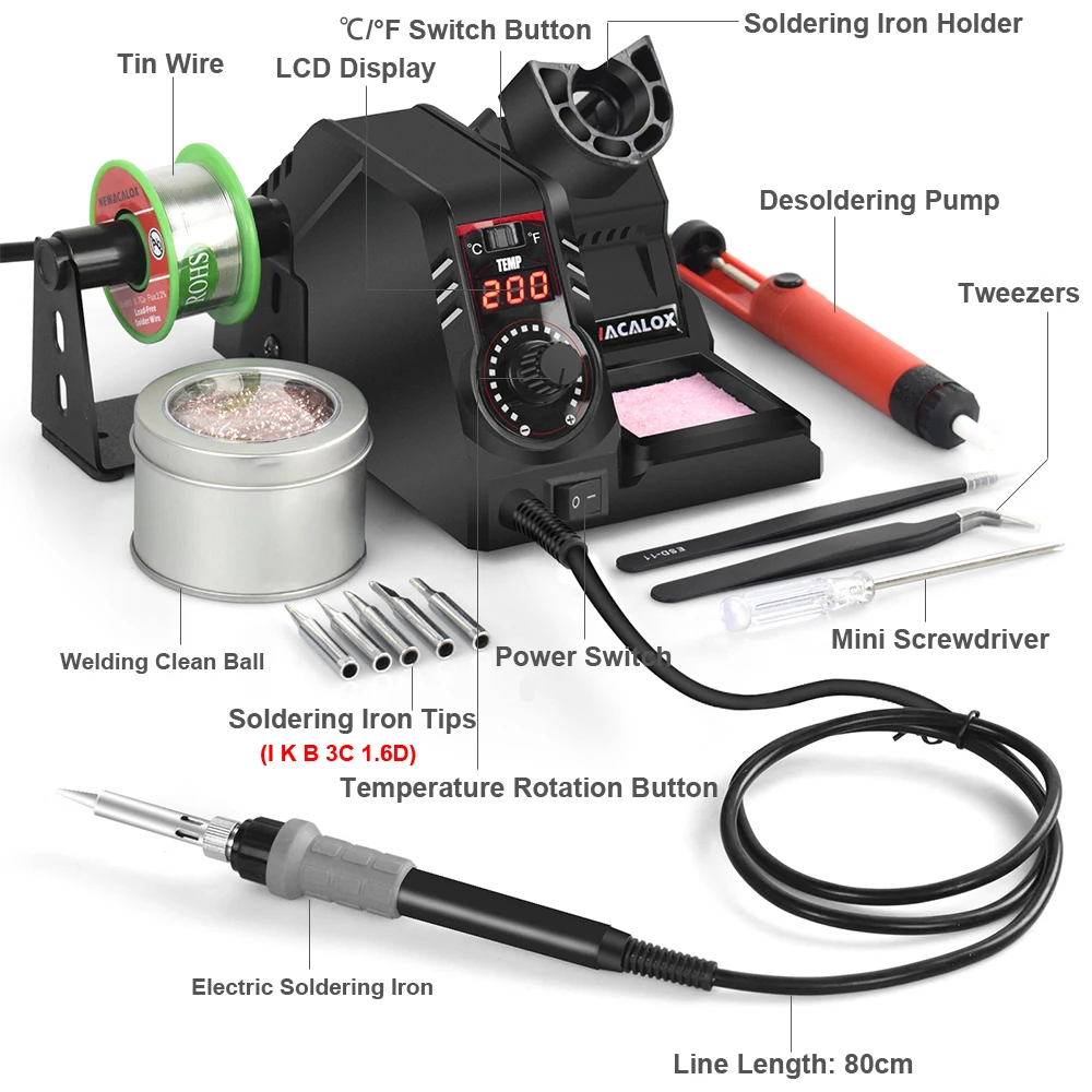 Посылка включает:1 шт. паяльная станция (ЕС 220 В/США 110 В/Великобритания 230 В)1 шт. устройство для всасывания олова1 шт. 1 мм паяльная проволока (50 г)1 шт. мини-отвертка1 шт. паяльник наконечник очиститель5 шт. запасных наконечников паяльника2 пинцета (тонкий кончик изогнутый, тонкий кончик прямой)