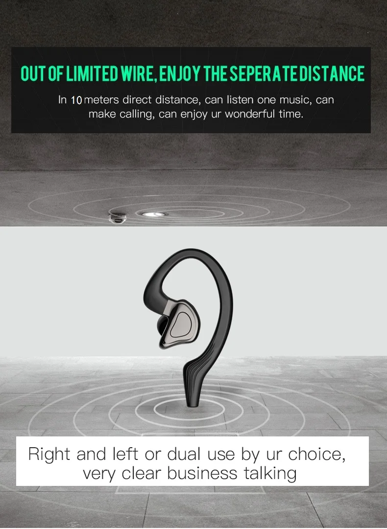 Особенности: • Настоящая Беспроводная Bluetooth гарнитура: левый канал правый канал наушники формируют стереозвук. • Встроенный литий-полимерный аккумулятор 50 мАч: Наслаждайтесь музыкой или просмотром ТВ и фильмов в течение длительного времени • Портативная мини-сумка: удобна для переноски и зарядки во время альпинизма, походов, езды на велосипеде или других видов спорта на открытом воздухе • Большой диапазон Bluetooth: Диапазон Bluetooth до 10-15 метров на открытом пространстве • Функции громкой связи: голосовое уведомление о входящих вызовах и номерах телефонов, простые в использовании кнопки позволяют воспроизводить/приостанавливать все ваши музыкальные треки, Не доставая телефон • Стабильность и удобство: Оптимизирован для дополнительного комфорта и посадки, облегчает проблему выскакивания, мягкий материал защищает уши и делает ваш телефонный звонок и музыку более приятными. • Защита от элементов: конструкция с защитой от пота идеально подходит для занятий спортом, бега, бега и тренировок в тренажерном зале • Напоминание: только основные наушники разрешают голосовой ввод. Можно использовать другие аудиовыходы, такие как музыка/видео.
