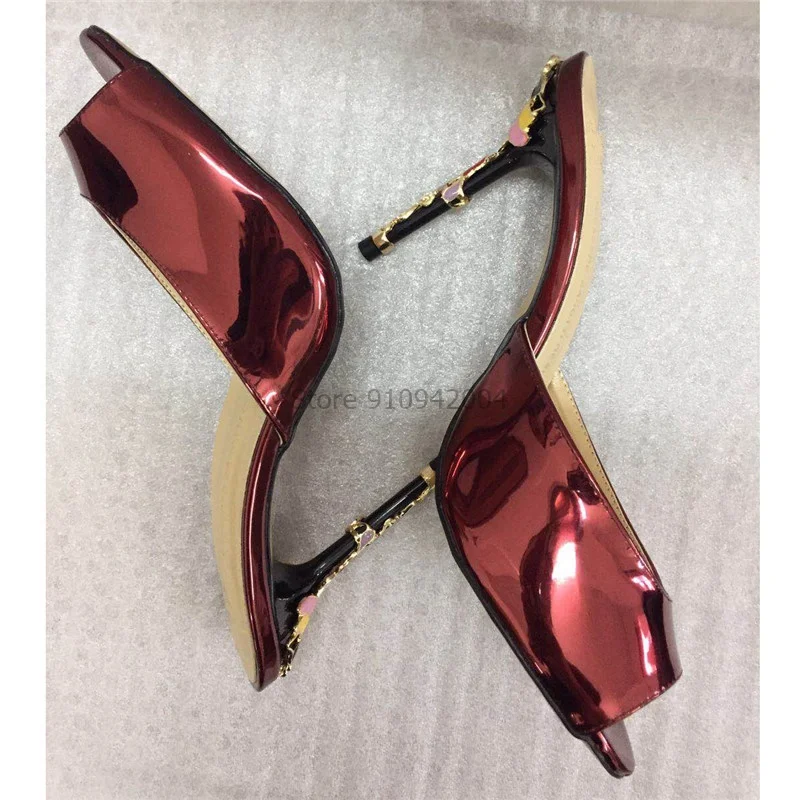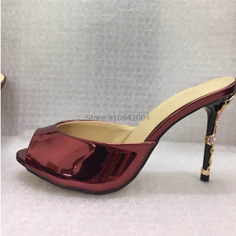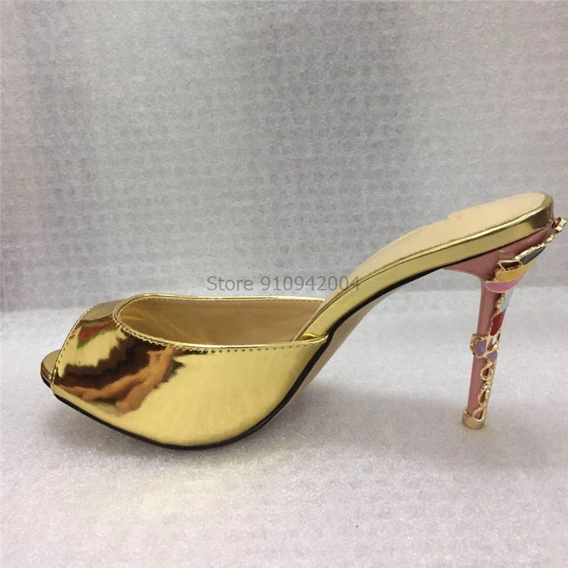 Синие сандалии из лакированной кожи; Женские вечерние модельные туфли с открытым носком на высоком каблуке; Яркие золотые металлические украшения; Женские шлепанцы