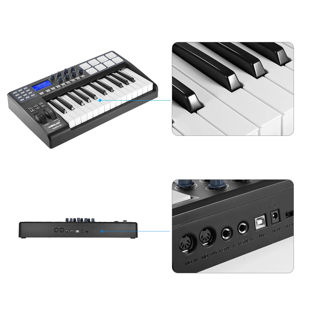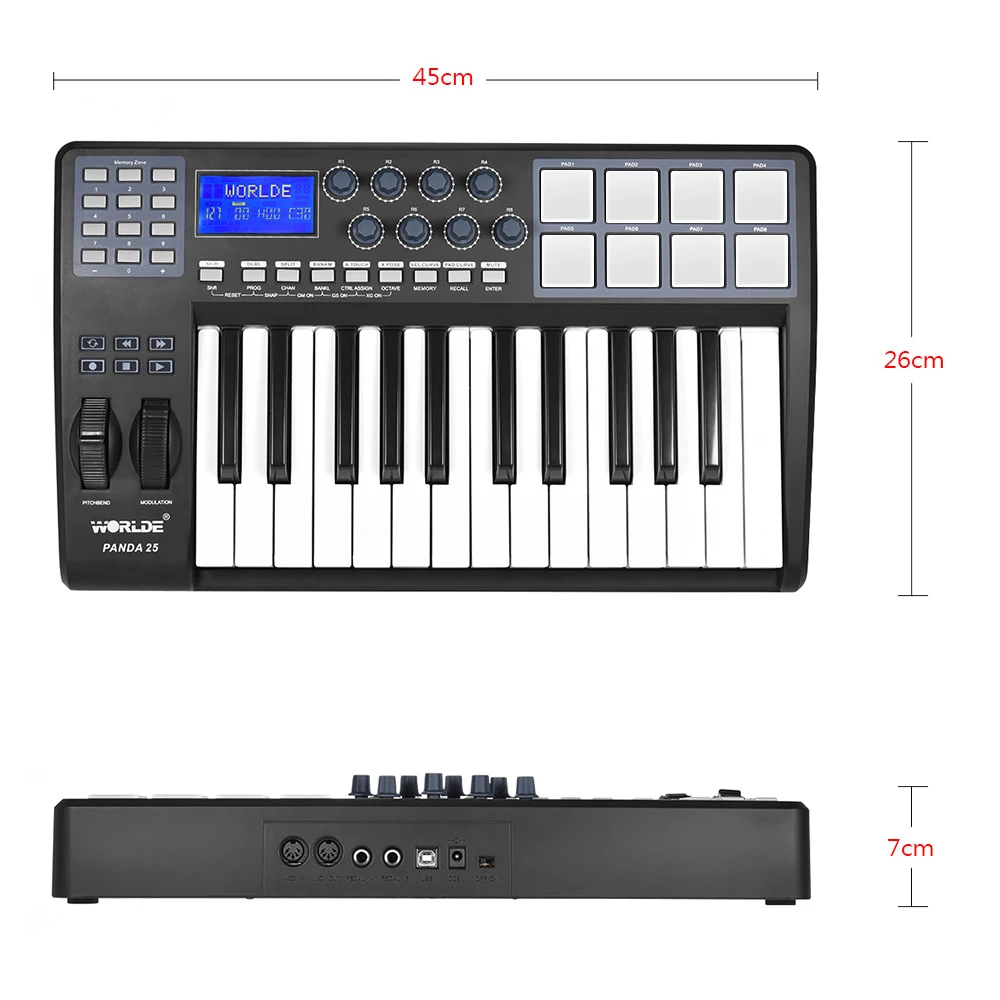 Контроллер клавиатуры USB MIDI с 25 настраиваемыми кнопками, чувствительными к скорости.