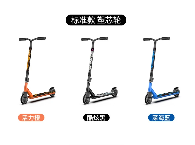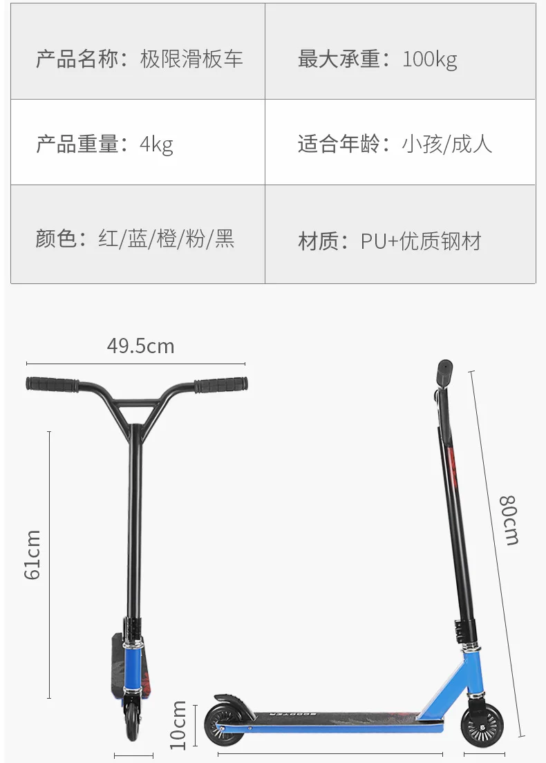 Название продукта: Экстремальный скутер Материал: 6061 авиационный алюминий + сталь Колеса: 100*24 мм высокоэластичное усиленное нейлоновое колесо из полиуретана Передняя вилка: высокопрочная штампованная передняя вилка Подшипник: ABEC-7 высокоскоростной подшипник Перчатки: Нескользящая Резина TPR Обработка поверхности: обработка распылением Размер игрушки: 68*11,5*50,5 см