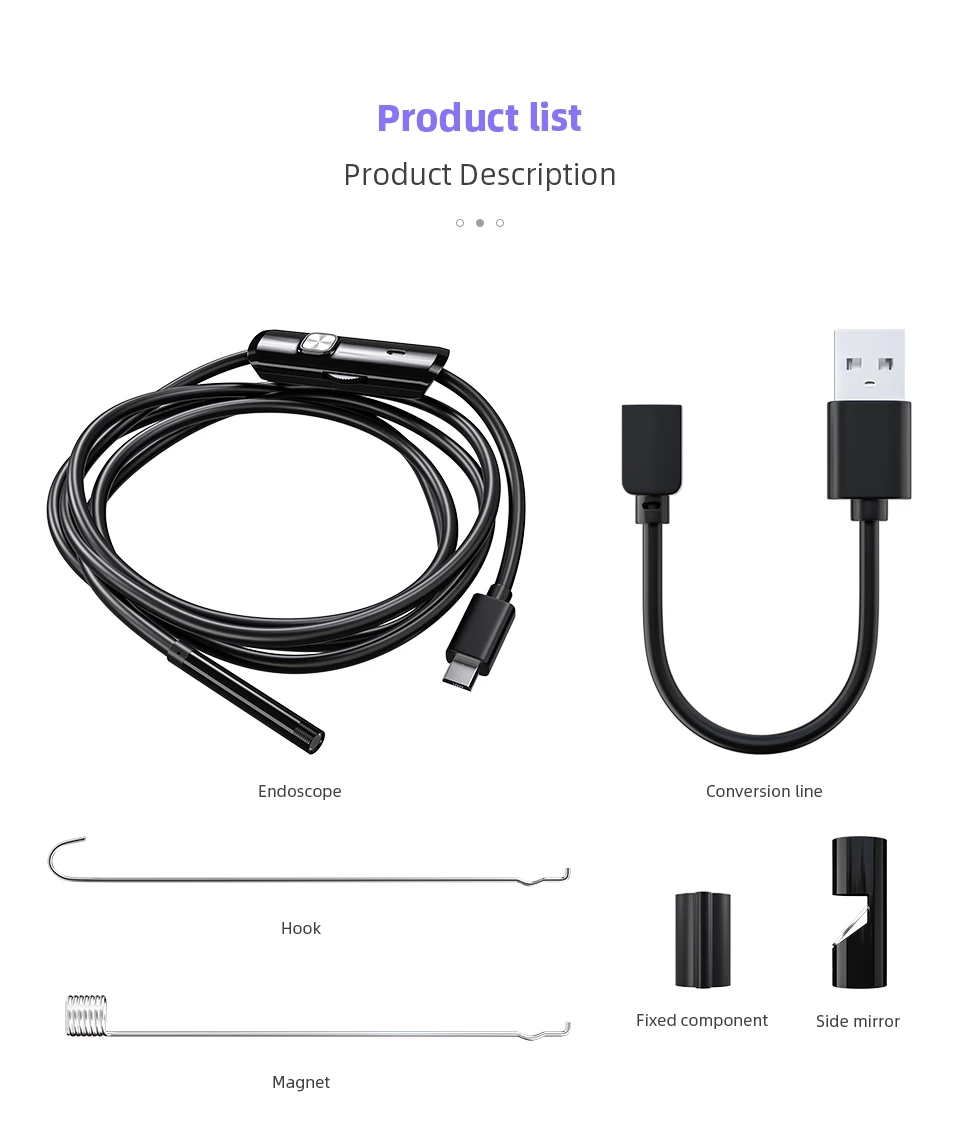 The Android endoscope is a new type of electronic product. The advantages of this product are: small size, light weight, the front camera housing diameter is 5.5mm/7.0mm, a control box is installed in the middle part (adjust the light and camera button. Note: The camera button can be used only when the computer is used. The phone can be used by Software to take pictures), you can adjust the brightness of six LED lights, capture images and take photos directly in the Android phone, you can record, record the entire process of inspection, to facilitate subsequent observation and analysis.