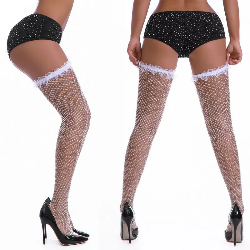 Женские сексуальные кружевные чулки до бедра с оборками, прозрачные гольфы в сеточку с бриллиантами