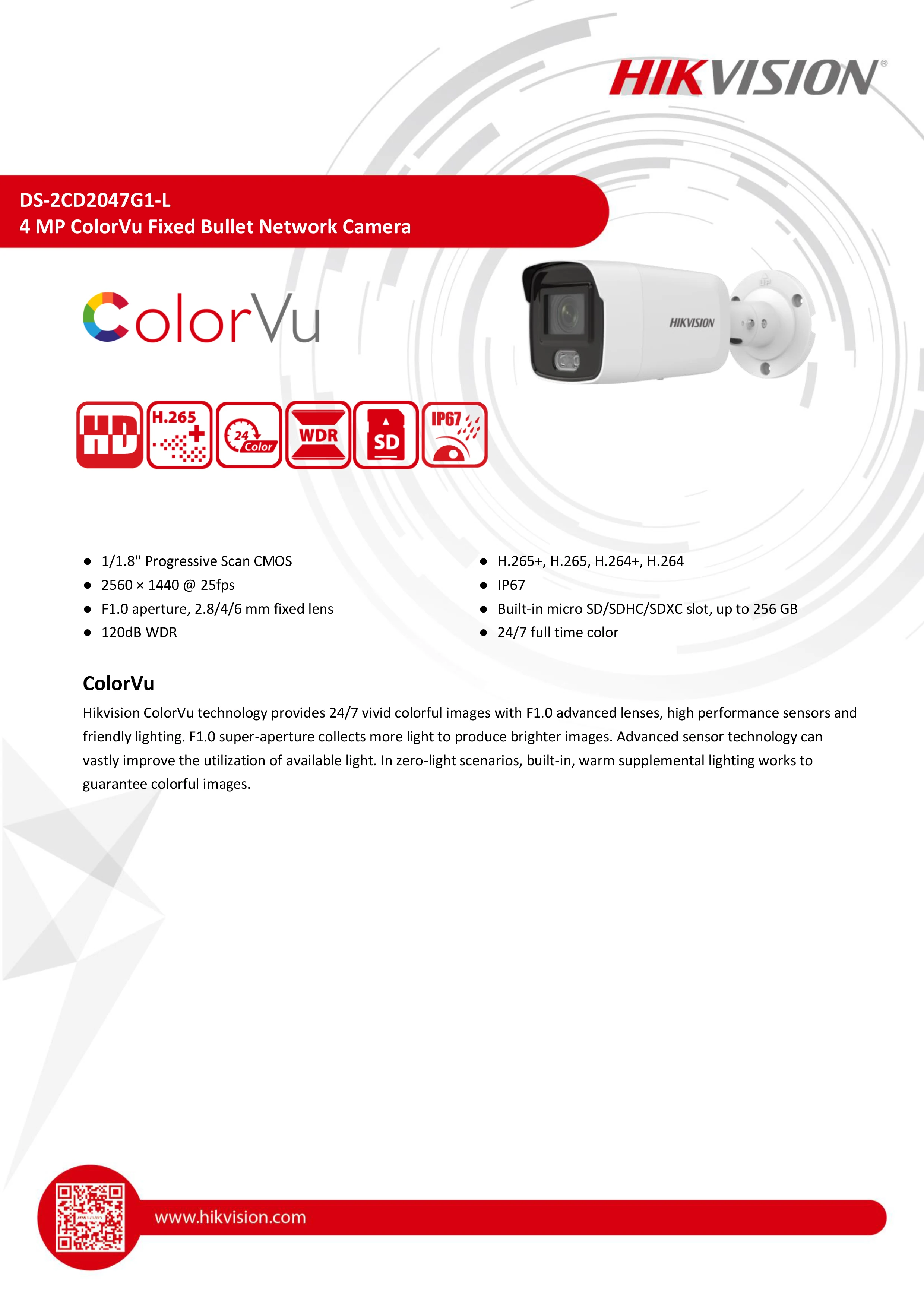 4 MP ColorVu фиксированная мини-пулевая сетевая камера Высокое качество изображения с разрешением 4 МП 24/7 Полноцветное Изображение Эффективная технология сжатия H.265 + Четкая визуализация Против сильный задний светильник из-за 120 дБ WDR технологии Водонепроницаемость и защита от пыли (IP67) Прочная конструкция с полностью металлическими материалами