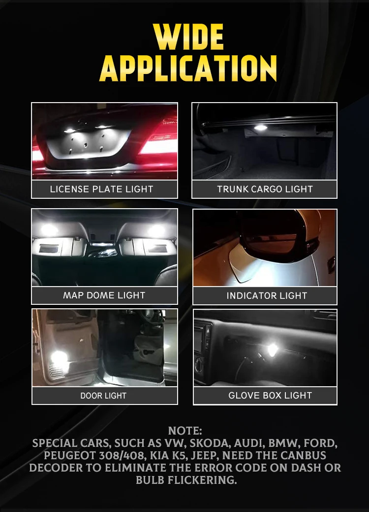 Применение: внутренний светильник, купольный светильник, светильник карты, потолочный светильник, панельный светильник, светильник номерной пластины, светильник footwell, светильник бардачка, грузовой светильник багажника и многое другое.