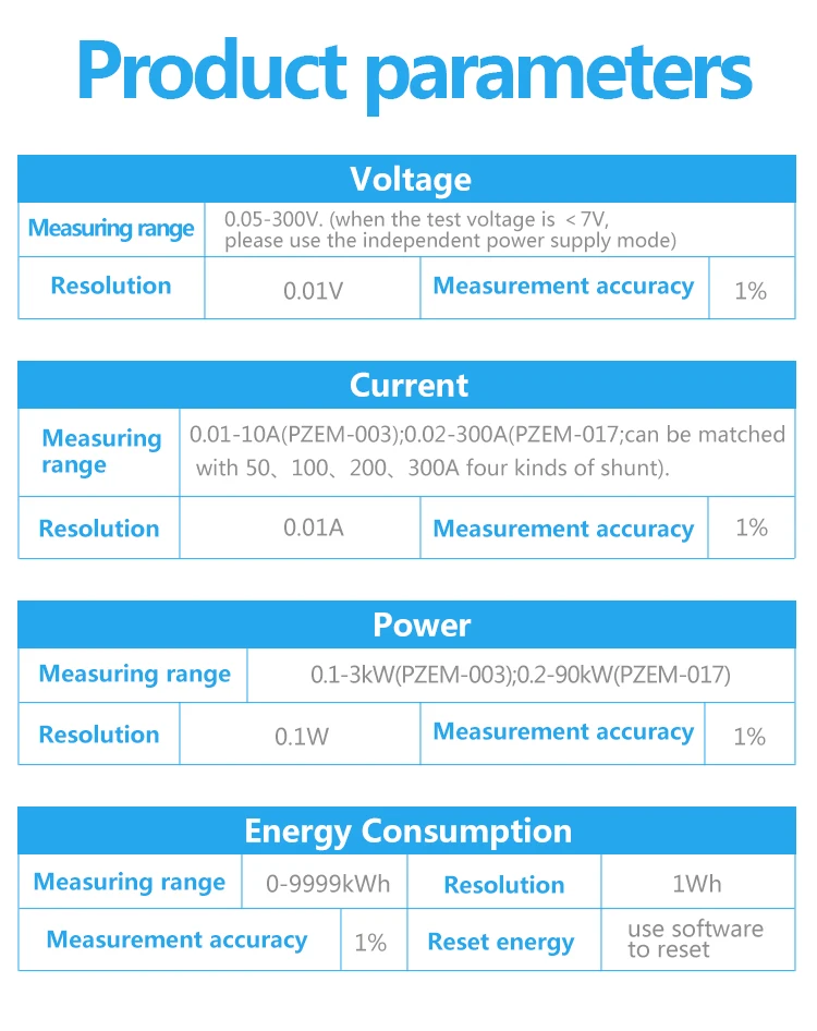 2,1 Диапазон измерения: 0.01-10A(PZEM-003);0.02-300A(PZEM-017; Может быть совместим с 50, 100, 200, 300A четырьмя видами шунта).
