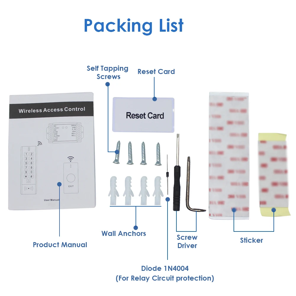Это набор устройств контроля доступа с корпусом ABS. Коммуникация более 433 МГц с использованием алгоритма шифрования TEA + rolling code. Комплект состоит из этих устройств: беспроводной клавиатуры, беспроводной кнопки выхода, контроллера.