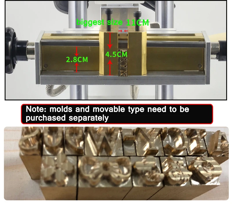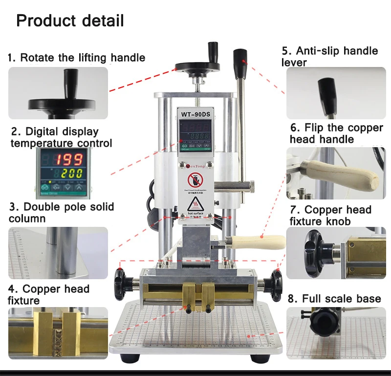 Название: машина с Медной головкой Вес нетто: 10,5 кг Мощность: 80 Вт Высота печати: 5 мм Диапазон температур: 50-240 Размер крепления: 110*45 мм Материал: железо, алюминий, пластик Сфера применения: горячее прессование/ПУ/кожа/штампованная бумага/Маркировка ПВХ/дерево и другие характеристики продукта Внешний вид: 280*250*420 мм