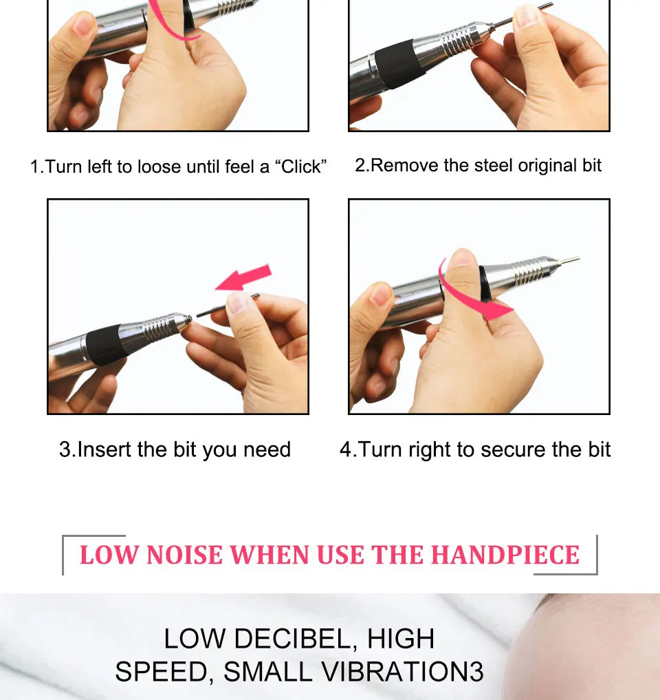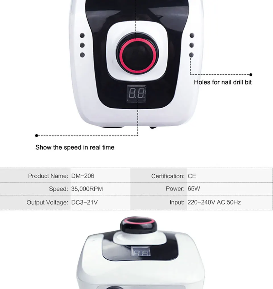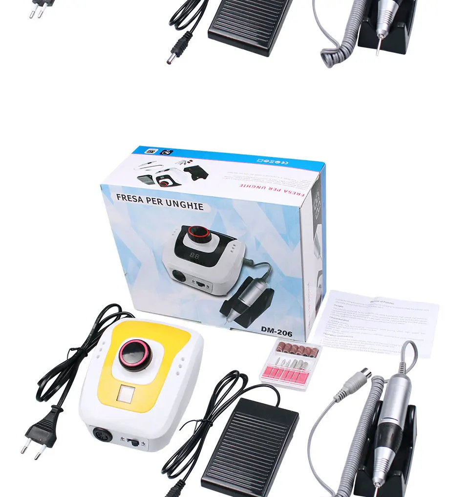 Скорость: 35000 об/мин Машина для маникюра Напряжение: 220 В дрель для ногтей 4 цвета на выбор: белый/черный/розовый/желтый полировальный станок для ногтей 1 основная машина; 1 наконечник; 1 ножная ведьма 1 Подставка для наконечника 6 сверл
