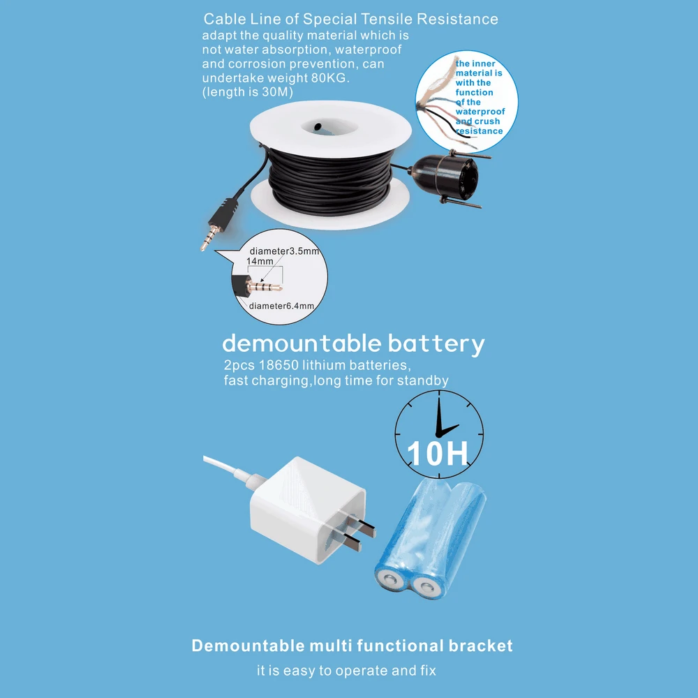 Широкоугольный объектив ночного видения высокой четкости соединен высокопрочной смолой, которая глубоко не давит и не подвержена коррозииСверхпрочный RF кабель (30 метров) HD водонепроницаемый объектив (5 миллионов)