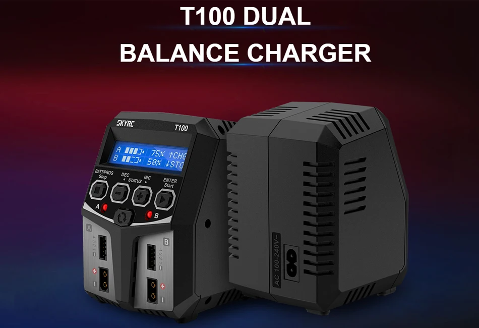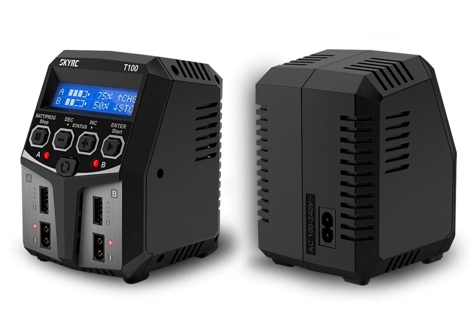SkyRC T100-это Двухканальное зарядное устройство с двумя независимыми схемами, которые могут заряжать батареи различных химикатов (LiPo / LiFe / Lilon / LiHV / NiMH / NiCd / Pb) одновременно. Благодаря элегантному дизайну легко подключается к разъему фронтальной загрузки, обеспечивая удобство балансировки и портов XT60. Это не только компактный размер, но и мощный на выходе с максимальной зарядной мощностью 100 Вт и ток зарядки 5A, что делает зарядку более достаточной. С новыми режимами AGM и холодной зарядки пользователь может бесплатно заряжать аккумуляторы PB и AGM в холодные дни.