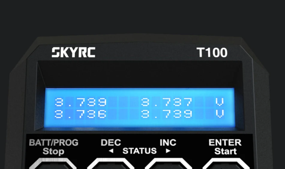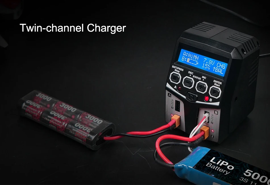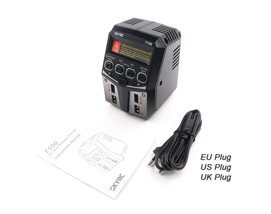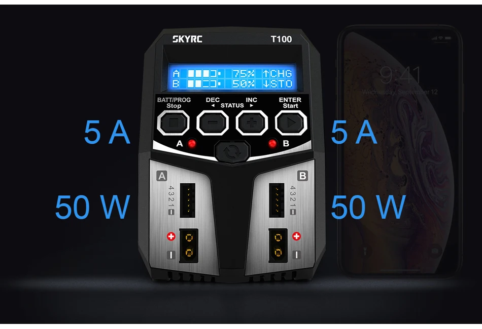 SkyRC T100 позволяет подключать 2 аккумулятора в одно зарядное устройство одновременно, и он будет интеллектуально и автоматически инициировать зарядку 2 батарей сразу до их максимальной емкости. К тому же заряженные батареи даже не должны иметь одинаковую конфигурацию. Вы можете подключить различные химические батареи (NiMH / NiCd / LiPo / LiFe / Lilon / LiHV / Pb) к любому из зарядных портов.