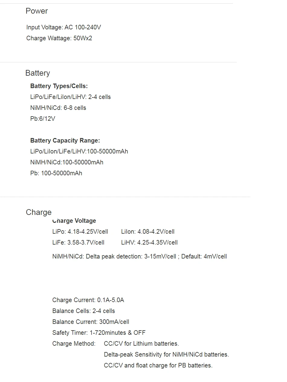Материал корпуса: пластик Чехол Размеры: 90x100x127mm Вес: 500 г Тип дисплея: 2x16LCD Подсветка дисплея: синий Входное напряжение: 100-240 В переменного тока Мощность зарядки: 50Wx2 Типы батарей/ячеек: LiPo/LiFe/LiIon/LiHV: 2-4 ячейки NiMH/NiCd: 6-8 ячеек Блок питания Pb:6/12V Емкость аккумулятора Ra nge: LiPo/LiIon/LiFe/LiHV:100-50000 мАч NiMH/NiCd:100-50000 мАч Pb: 100-50000 мАч Напряжение зарядки: Липо: 4,18-4,25 в/ячейка Срок службы: 3,58-3,7 V/cell LiIon: 4,08-4,2 V/cell LiHV: 4,25-4,35 в/cellNiMH/NiCd: обнаружение: 3-15 мВ/ячейка; По умолчанию: 4 мВ/ячейка Напряжение отключения разряда: Зарядное устройство LiPo: 3,0-3,3 V/cell Срок службы: 2,6-2,9 V/cellLiIon: 2,9-3,2 V/cell LiHV: 3,1-3,4 V/cellNiMH/NiCd: 0,1-1,1 V/cell Ток зарядки: 0.1A-5.0A Баланс клеток: 2-4 ячейки Баланс тока: 300 мА/ячейка Таймер безопасности: 1-720minutes & OFF Метод зарядки: CC/CV для литиевых батарей. CC/CV и поплавковый заряд для PB батарей.