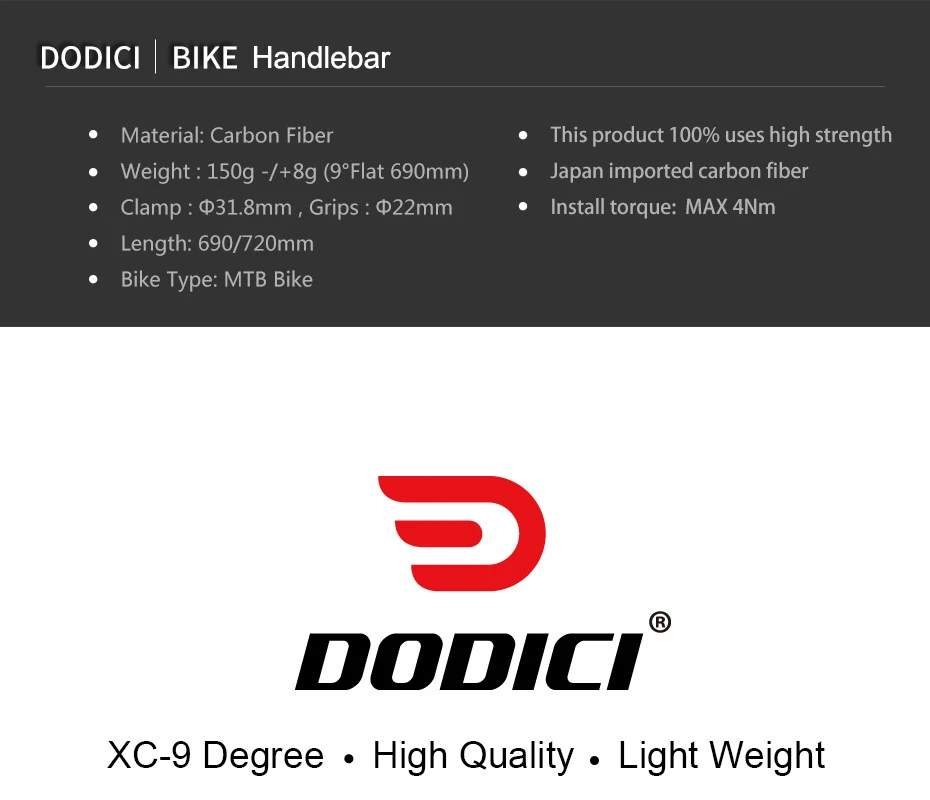 Brand:DODICI Name:MTB Handlebar Series:Dodici 9 degree Flat Handlebar Material:Full Carbon Fiber Appearance:UD Matte Color:Black(Red Green Blue Yellow) Handlebar Clamp:31.8mm Handlebar Grips:22mm Length:690/720mm Weight:About 150g -/+8g (Riser 690mm) Bike Type:MTB Bike Install Torque:MAX 4Nm Do Not Over-Tighten The Clamp Or Damage Can Occur To Handlebar. Passed EN14766 , EN14781 Standards And the JAPAN JIS Standards.