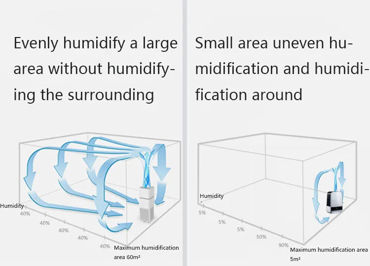 * Метод испарительного увлажнения производит влажный воздух, который может равномерно распределиться по всему дому * Ультразвуковое увлажнение производит крупные капли воды (белый туман), которые могут приземляться только вокруг увлажнителя, в результате чего вода вблизи и сухая на расстоянии.