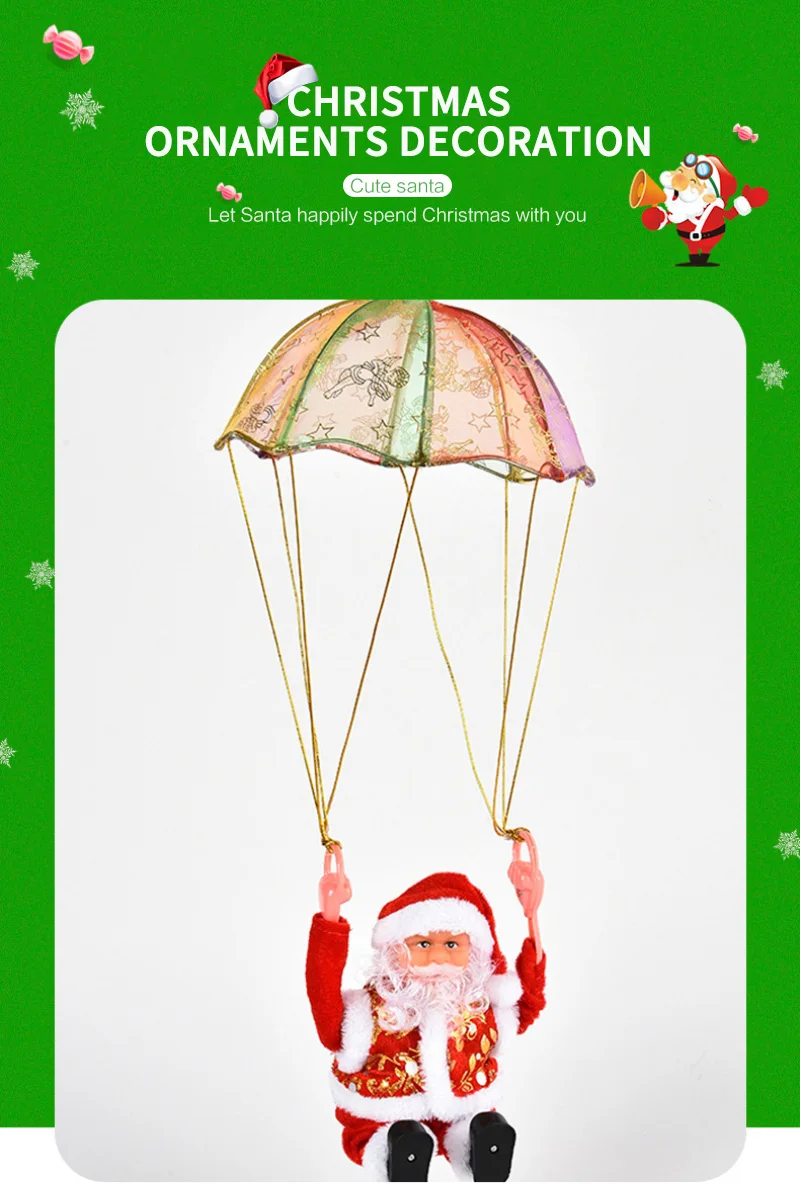 Игрушка с парашютом Санта-Клауса, очень милая и забавная. Электрический Санта-Клаус вращается вокруг, что легко привлечет внимание ребенка. Это может украсить ваш дом и повысить праздничную атмосферу, что делает ваше Рождество более интересным, что лучший выбор для ваших детей в качестве рождественского подарка.