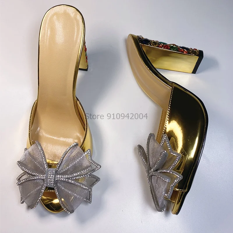 Класса люкс с отделкой кружевом и украшением «бант вечерние туфли золотистого цвета со стразами на квадратном каблуке на платформе с открытым носком стразы на высоком каблуке; Летние шлепанцы; Женские Butterfy сандалии