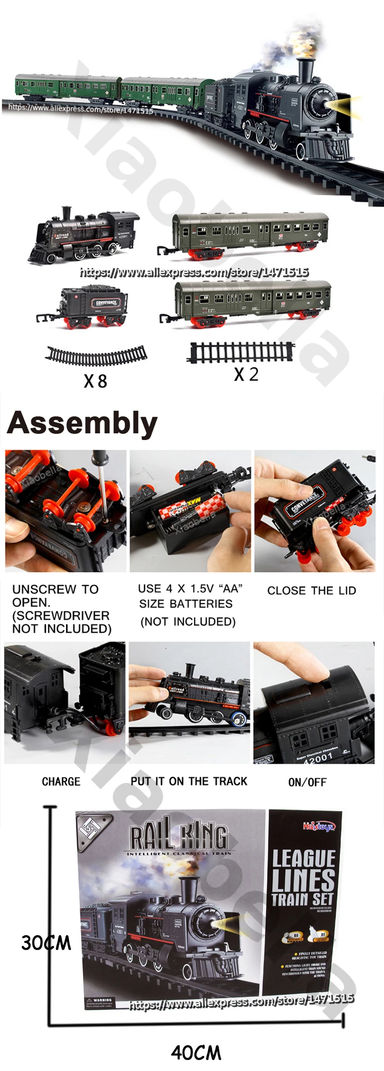 Размеры локомотива: 7x1 ¾ x 2 ¾ дюйма Посылка Размеры: 16x12x3,5 дюйм (ов) Мелко детализированный Паровозик и три вагона 40,5 "x 30,7" овальной части оснастки. Это составляет до 10 футов модульных треков! Функция: освещение, пар и звук поезда. Паровозик smokestack движется вверх и вниз Взаимозаменяемые треки легко соединяются Помогает детям младшего возраста развивать координацию рук и глаз и помогает им развивать когнитивные навыки и создавать воображаемые сценария для игры. Визуальное восприятие упражнений, чтобы помочь распознаванию цвета Материалы, изготовленные в соответствии с международными стандартами безопасности и здоровья. Экологически чистый, безопасный и нетоксичный. Всего 16 штук