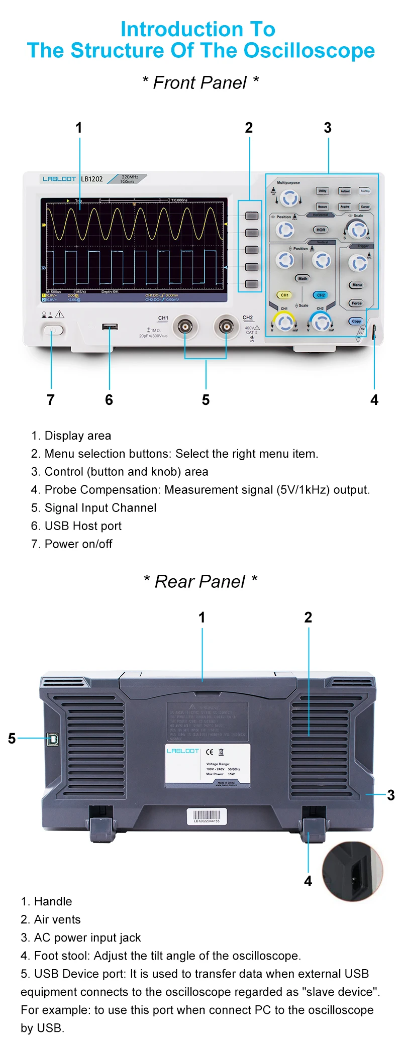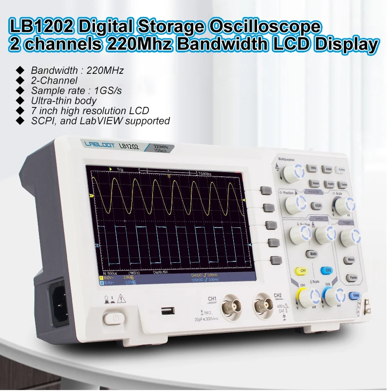 Особенность: LB1202 Сверхэкономичный цифровой запоминающий осциллограф + Полоса пропускания: 220 МГц + 2-канальный + Частота выборки: 1 г/с + Ультратонкий корпус + 7-дюймовый ЖК-дисплей высокого разрешения + Поддержка SCPI и LabVIEW + Время подъема: <= 1,75 нс