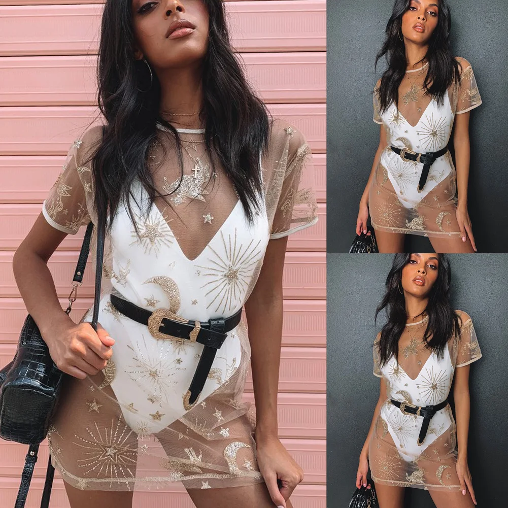 Hirigin женское летнее пляжное платье с принтом звезды луны и блестками, с круглым вырезом, с коротким рукавом, Сетчатое Прозрачное мини-платье, бикини, накидка