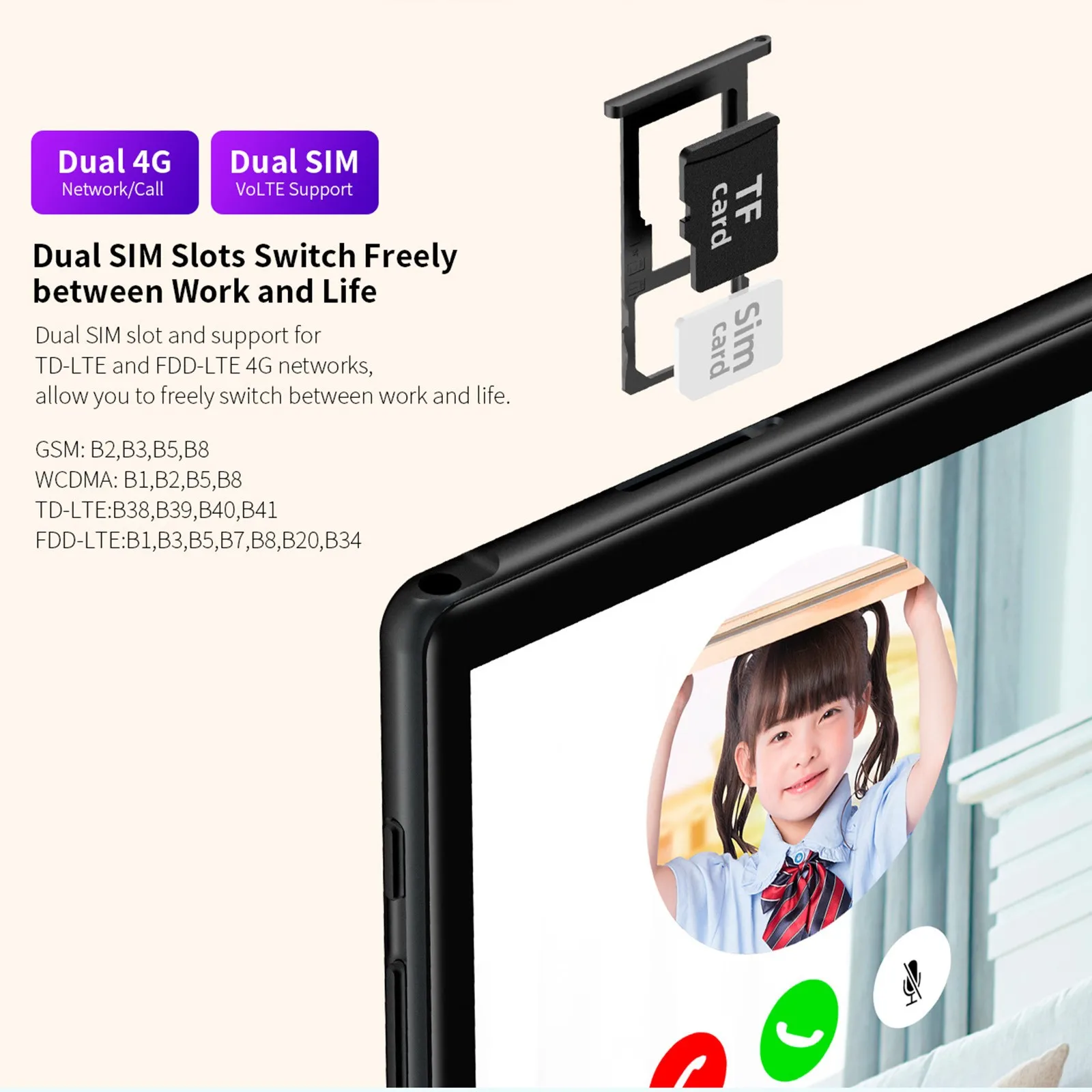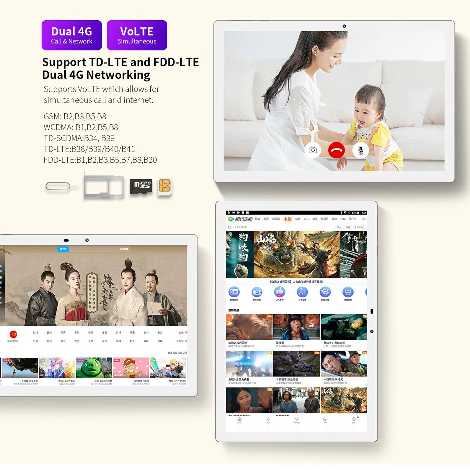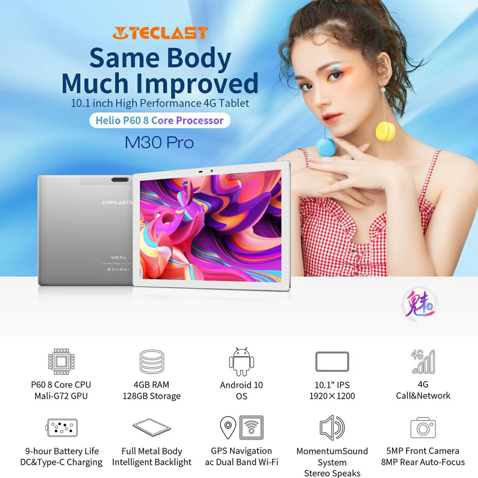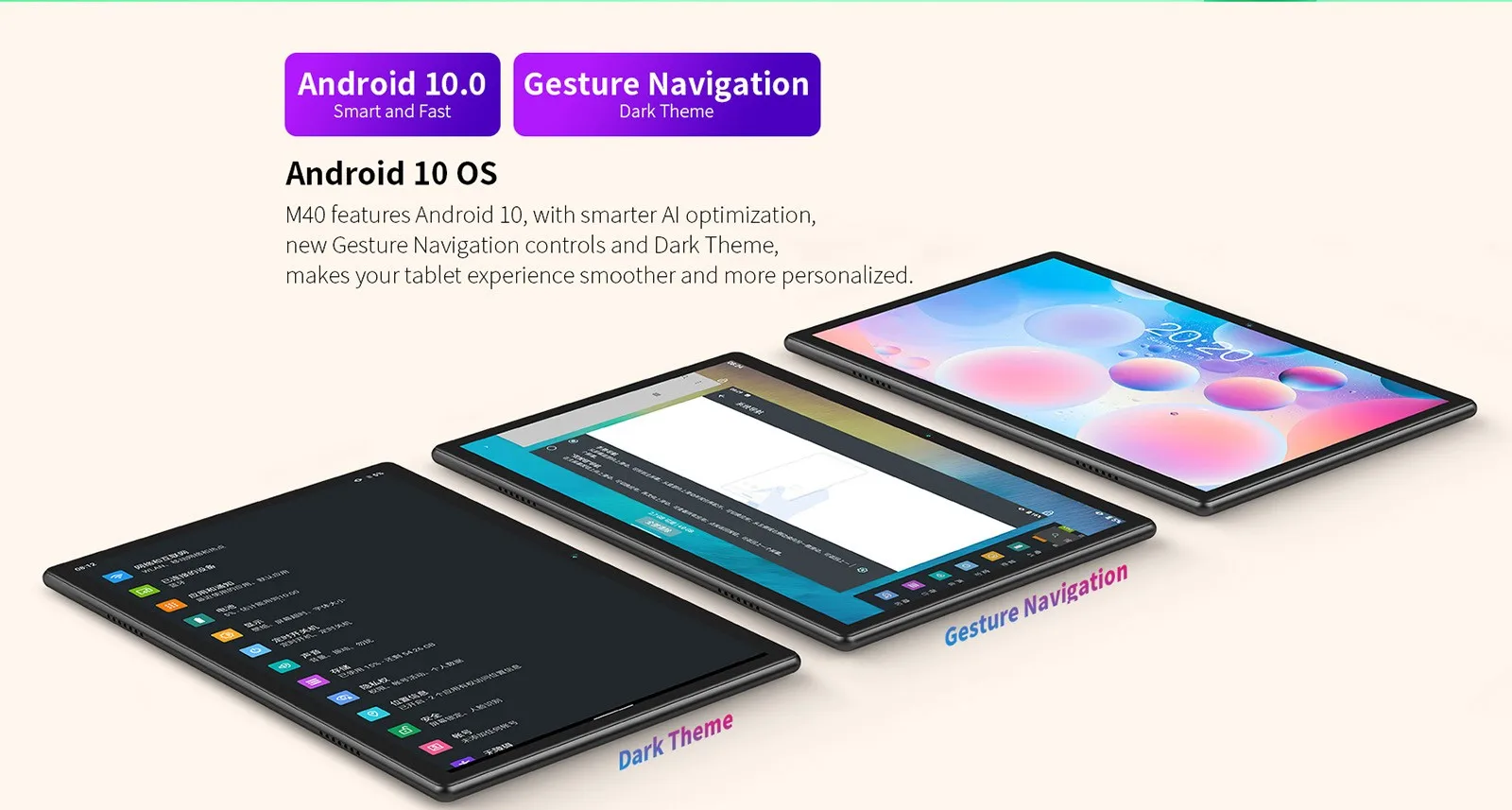 Supporting Language Language Support: English, Russian, Spanish, Swedish, Portuguese, Turkish, Italian, German, Chinese, French, Japanese, Polish, Ukrainian, Greek, Hebrew, and more. Dual SIM Slots Switch Freely Between Work and Life T618 Octa Core CPU 200000 + AnTuTu Benchmark Score The UNISOC Tigre T618 is powered by two Arm Cortex-A75 cores and six Cortex-A55 cores. Wide Viewing Angle 10.1 inch FHD IPS display with wide viewing angle brings you an amazing visual experience. Android 10 OS M40 features Android 10, with smarter AI optimization, new Gesture Navigation controls and Dark Theme, makes your tablet experience smoother and more personalized. Dual SIM slot and support for TD-LTE and FDD-LTE 4G networks, let you switch freely between work and life. GSM: B2, B3, B5, B8 WCDMA: B1, B2, B5, B8 LTE: B1, B3, B5, B7, B8, B20, B34, B38, B39, b40, B41 Lightweight and Slim Metal Body M40 has a light and slim metal body. Combined with 2.5D panel and curved edge, M40 brings you a soft of experience. Long Life Battery Its large 6000mAh battery capacity can easily support you to enjoy reading, browsing, watching movies and playing games.Basic Information