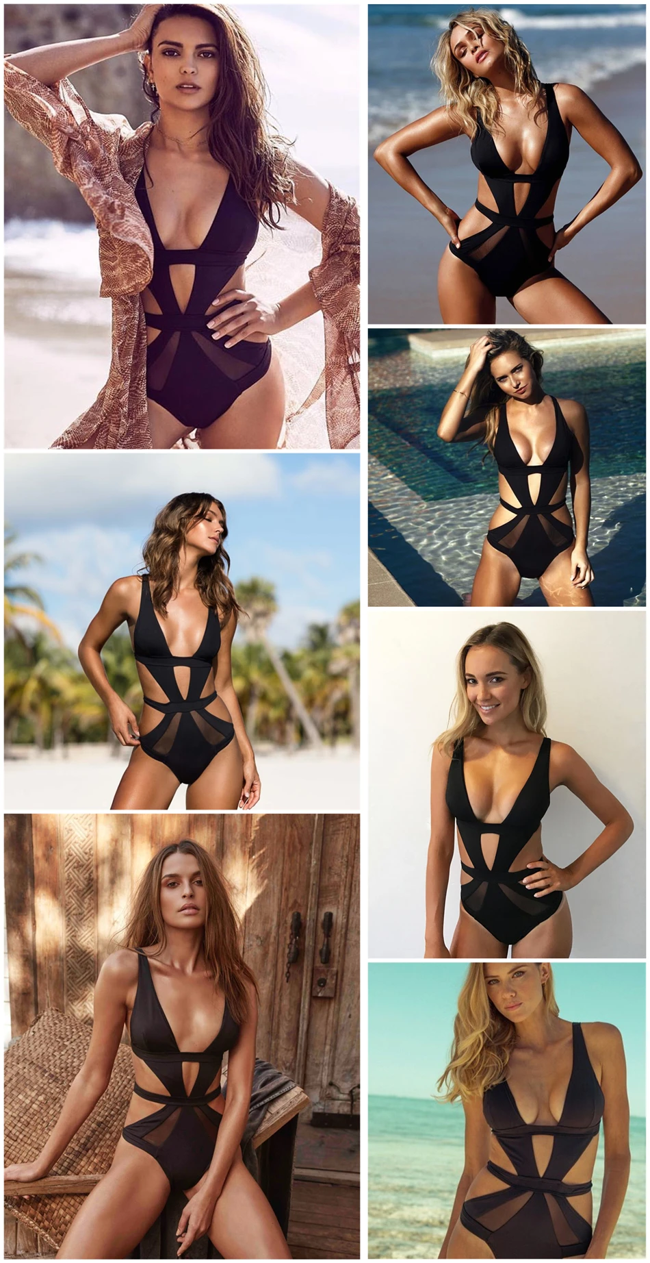 Черный треугольный вырез, сексуальный сетчатый лоскутный Женский цельный купальник, открытая повязка, бикини, купальник с высоким вырезом, купальный костюм, монокини, Размер: S/M/L/XL