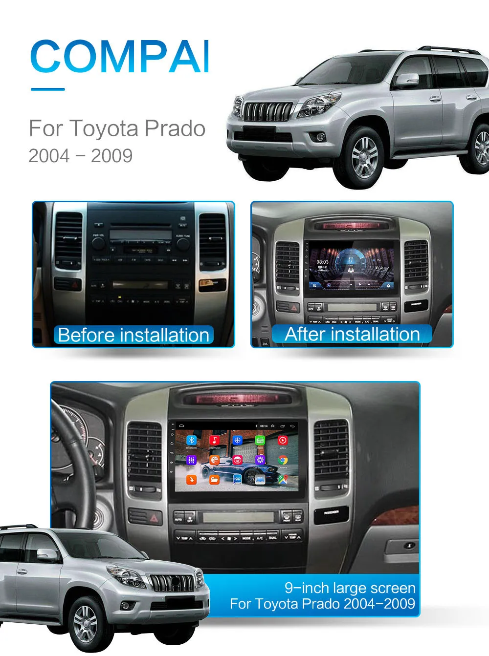 Android 9,0 автомобильное радио Toyota Land Cruiser Prado 120 2004 2005 2006 2007 2008 2009 9 дюймов 1024*600 8 ядер wifi Bluetooth Видео Аудио мультимедиа 2 din автомобильный dvd плеер