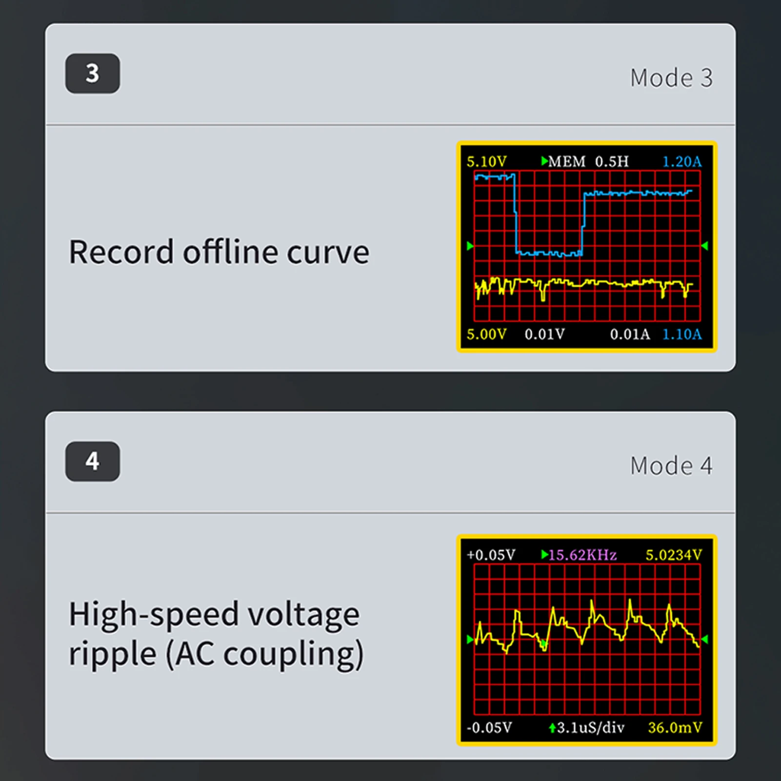 Пятиразрядный или шестиразрядный дисплей можно переключать одной кнопкой с максимальным разрешением 0,00001, что позволяет в режиме реального времени отслеживать незначительные изменения напряжения, тока и мощности во время подзарядки.