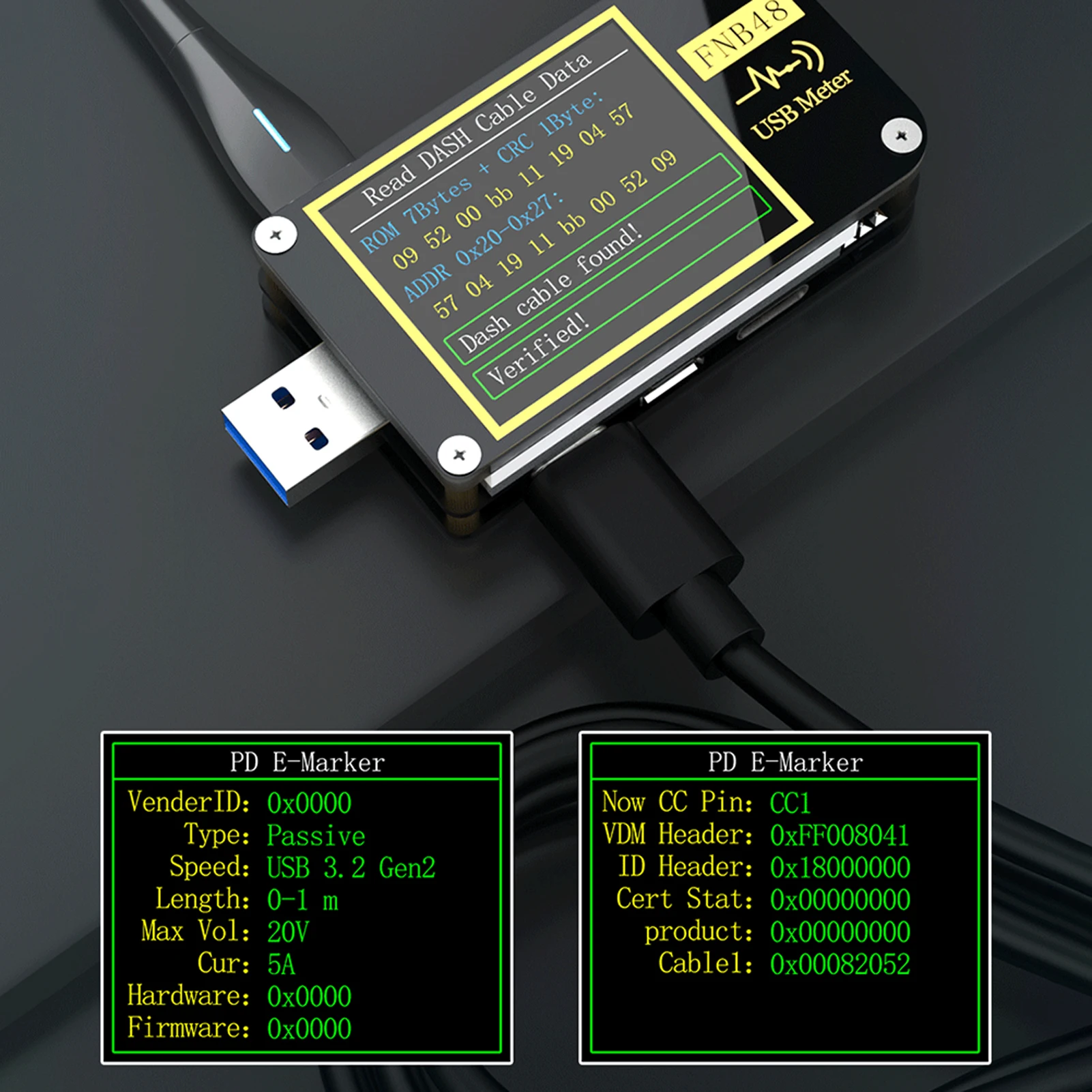 Этот продукт поддерживает Считывание данных E-Marker и DASH кабеля, а чипы e-marker и DASH кабелей можно легко прочитать после подключения линий передачи данных.