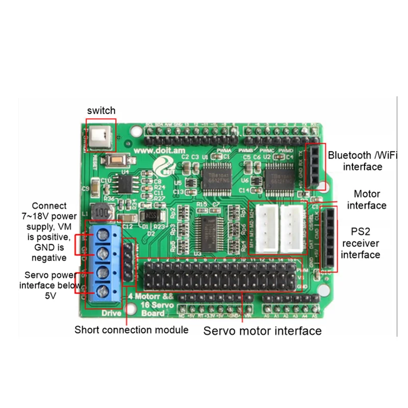 16 дорожных серводвигателей и 4 дорожных моторных приводов, с использованием TB6612 4 дорожных дисков, PCA9685 для 16 дорожных серводвигателей.