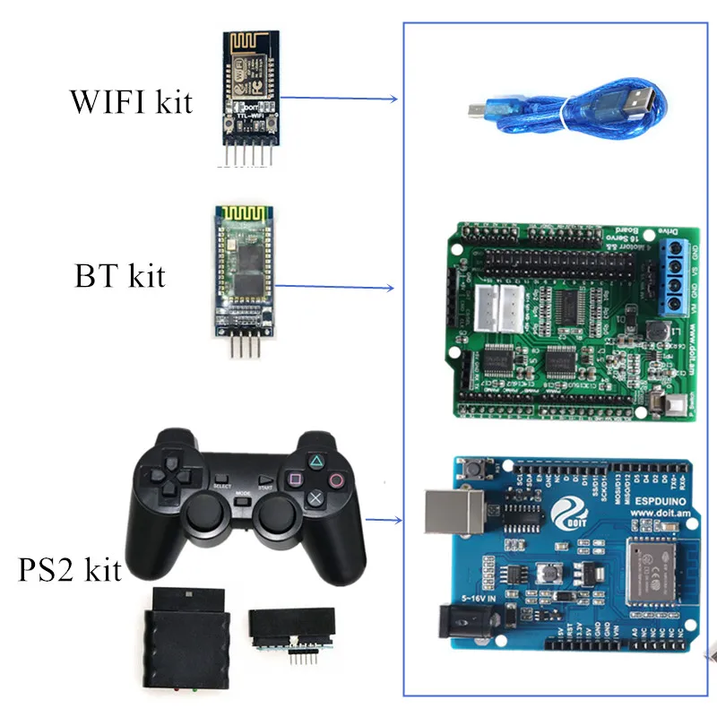 Может управляться с помощью wifi (DT-06), Bluetooth (HC-06) и PS2 станции;