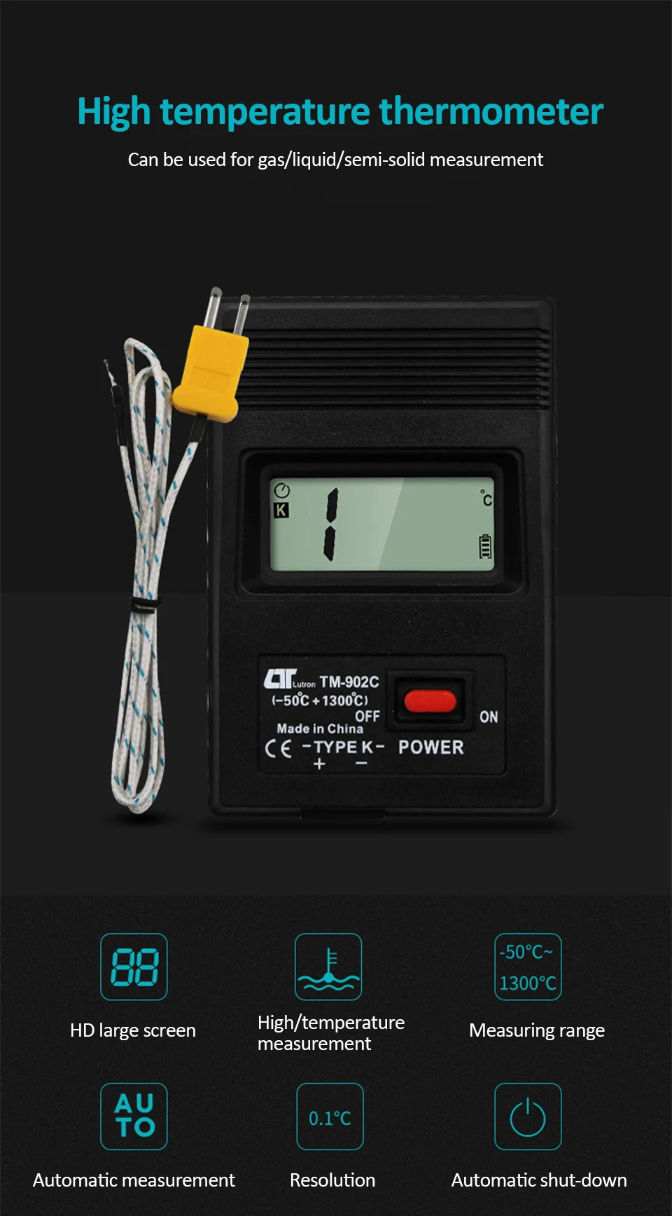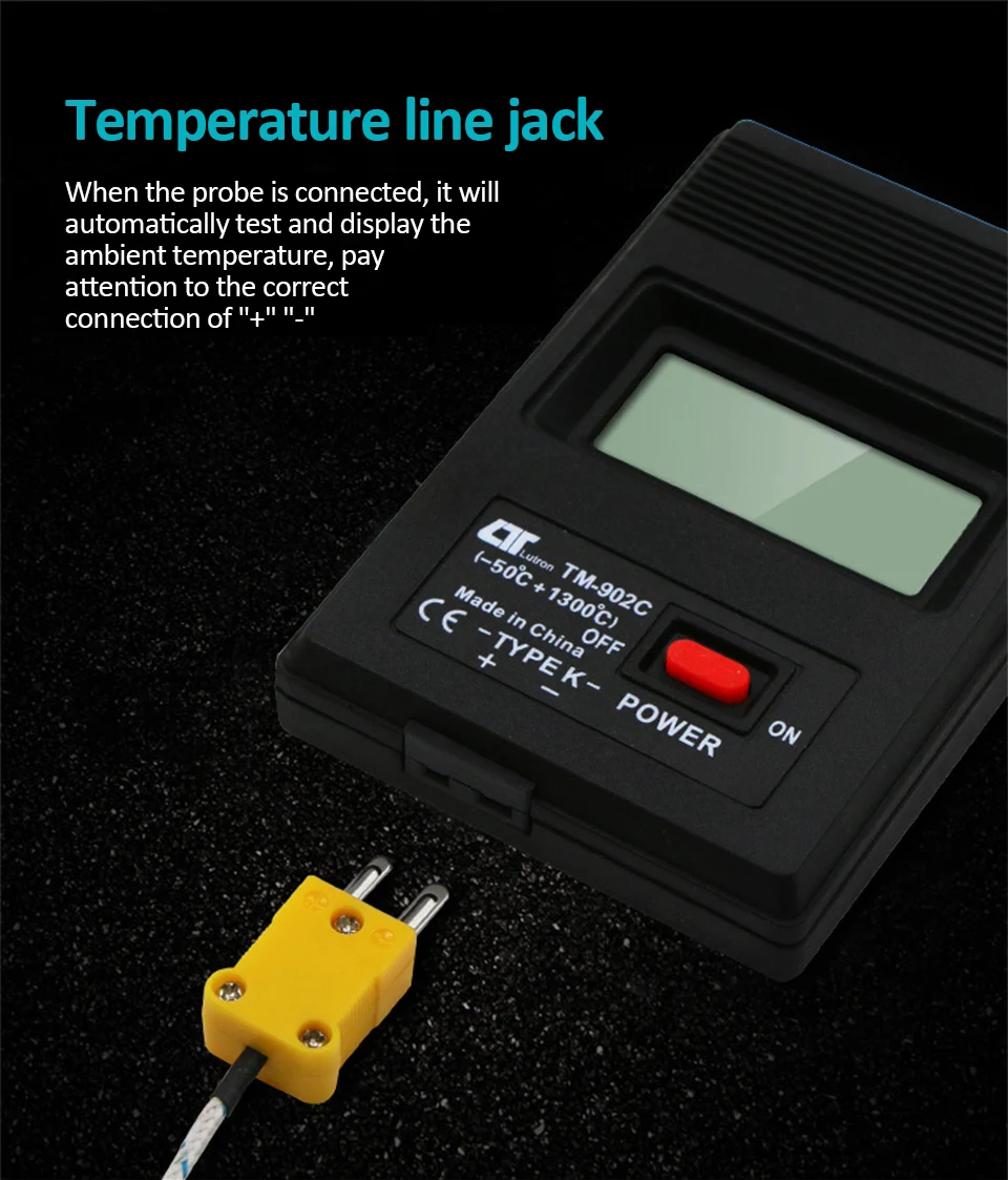1. Может использоваться с любым стандартным датчиком k-типа (NICR-NIAI), поддерживающим использование; 2. Для стандартного К-типа зонда; 3. ЖК-дисплей позволяет даже в ярких местах четко читать данные дисплея; 4. Маломощный ЖК-дисплей; 5. LSI с высокой надежностью и долговечностью; 6. Высокая точность и диапазон измерения светильник; 7. Прочный, легкий и простой в эксплуатации; 8. Используйте высококачественный многооборотный переменный резистор, термометр для поддержания высокой точности и высокой надежности; 9. Линия с использованием высококачественных компонентов для обеспечения точности и надежности температурного диапазона; 10. Функция автоматического отключения. Характеристики: Название: TM-902C термометр Измерение температуры: -50 ℃ ~ 1300 ℃ Разрешение: 0,1 ℃ (-50 ~ 1000 ℃), 1 ℃ (1000 ~ 1300 ℃) Точность: ± 1% ℃ (не включая погрешность датчика) Рабочая температура: 0 ℃ ~ 50 ℃, относительная влажность ≤ 70% RH Температура хранения: -10 ℃ ~ 60 ℃, относительная влажность ≤ 70% RH Тип батареи: AAA 1,5 V * 2 (не прилагаются) Вес изделия: 107 г