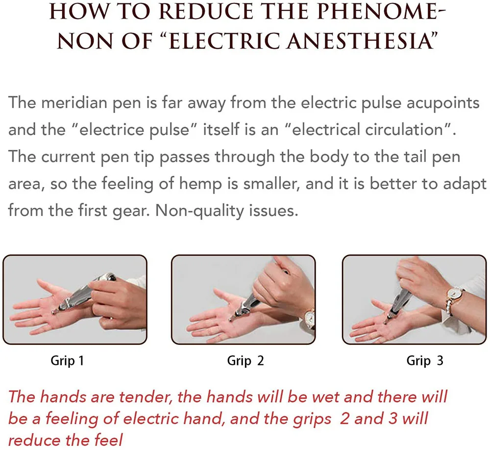 Принцип лечения электронной акупунктурной ручки используется электрические импульсы для стимуляции акупунктурных точек, затем для активации клеток и дноуглубления канала, в то время как есть условие для генерации электрического импульса, то есть, необходимо включить положительные и отрицательные полюсы тока. Ручка является монопольным током (наконечником), поэтому другой полюсный ток должен проводиться руками и образовываться окружность с nid электронной акупунктурной ручки, так что он будет производить электрические импульсы. Так что это нормально, чтобы почувствовать небольшое онемение удерживающей руки, это то, как Меридиан ручка работает, Не проблема качества. В ходе текущего процесса возврата, в зависимости от размера сопротивления рук, сила, которую вы чувствуете, будет немного отличаться. Некоторые люди будут чувствовать себя более сильными, а некоторые будут чувствовать себя слабыми. Молодые люди или люди со здоровьем будут чувствовать себя немного сильнее. Люди пожилого возраста или в плохом состоянии будут чувствовать себя слабыми. Феномен, как «Электрическая утечка, электрическое онемение, электрическая стимуляция» электронной акупунктурной ручки, как описано выше, не является проблемой качества, но ее Принцип лечения.