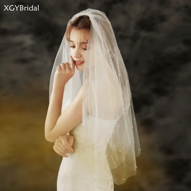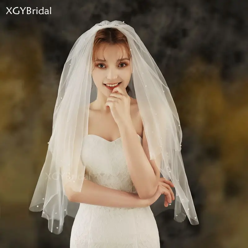 Кружевная вуаль с жемчугом, двухслойная дешевая короткая фата для невесты, свадебная фата цвета слоновой кости для церкви