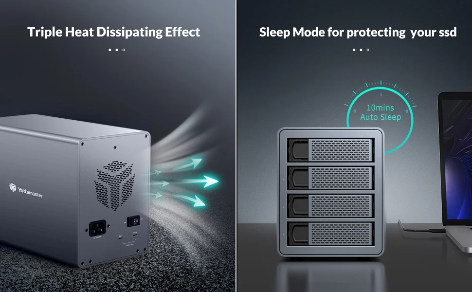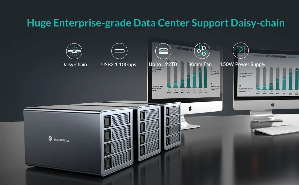Корпус жесткого диска Yottamaster изготовлен из алюминия. Он не только обеспечивает стабильную структуру во время работы, но и обеспечивает долгосрочное использование. Плюс 80 мм бесшумный вентилятор, метеоритные отверстия охлаждения на передней и задней панели и ультра крутой алюминиевый корпус, чтобы ваши диски были прохладными в течение долгих часов работы.